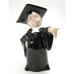 Keramik. Weißer Scherben mit inkarnat- und goldfarbener, schwarzer, weißer und roter Bemalung. Erhobenen Hauptes und mit vor Stolz geschwellter Brust in demonstrativer Geste die Linke vorweisender Doktorand im Talar mit Doktorhut. Hutrand rest. Glasurabschürfungen am Gewand und Mittelfinger, 1 Finger rest. H.: 25,2 cm. Bez.: Lenci MADE IN ITALY R.F. mit Zusatz g (gemalt) und ungedeuteter Preßmarke. 1930er Jahre