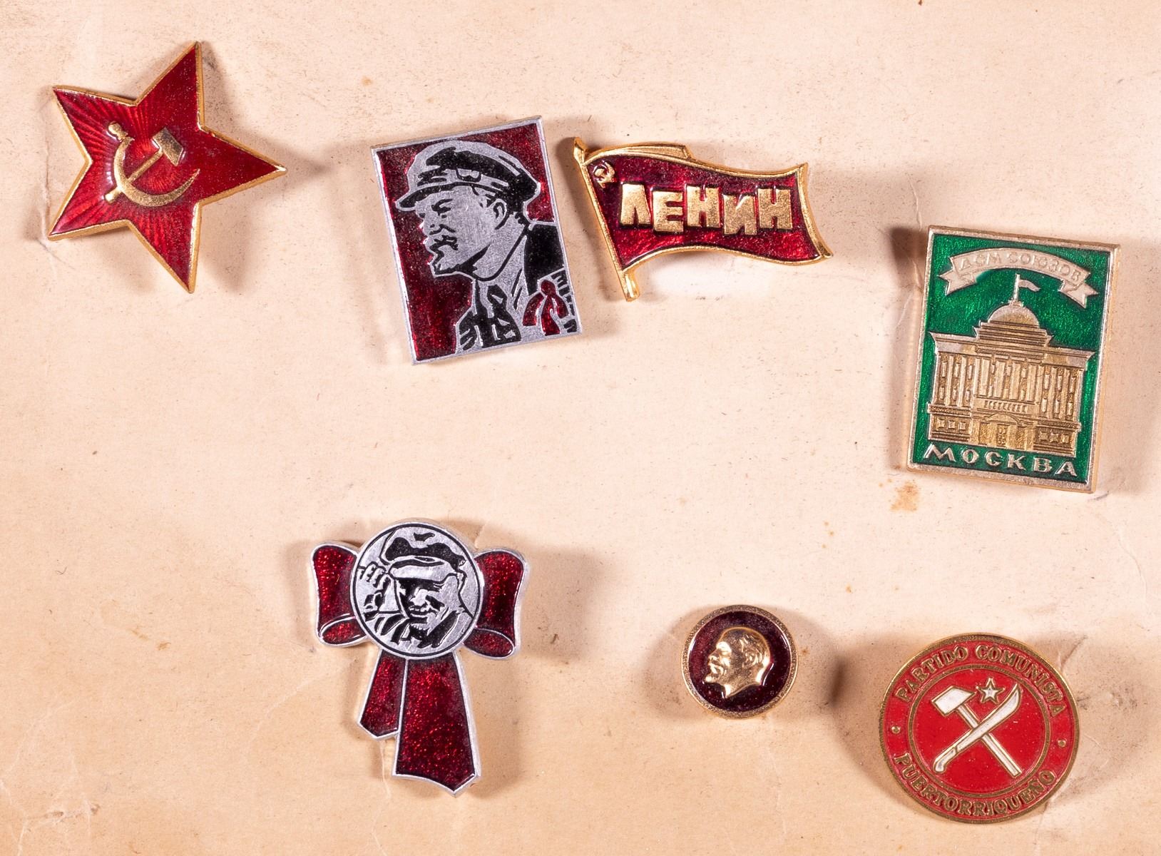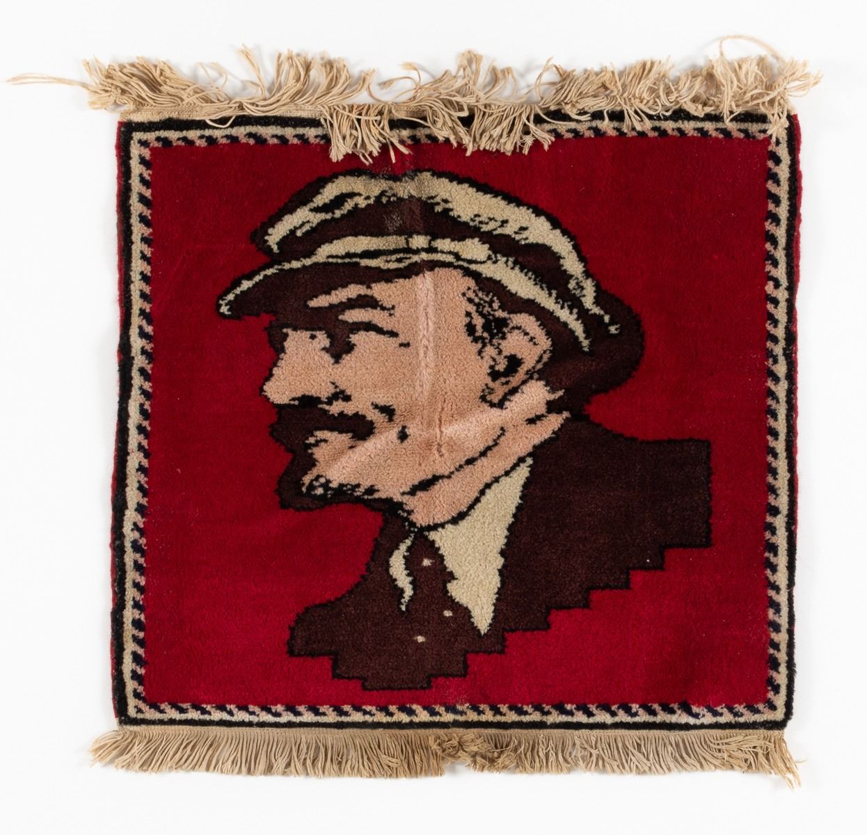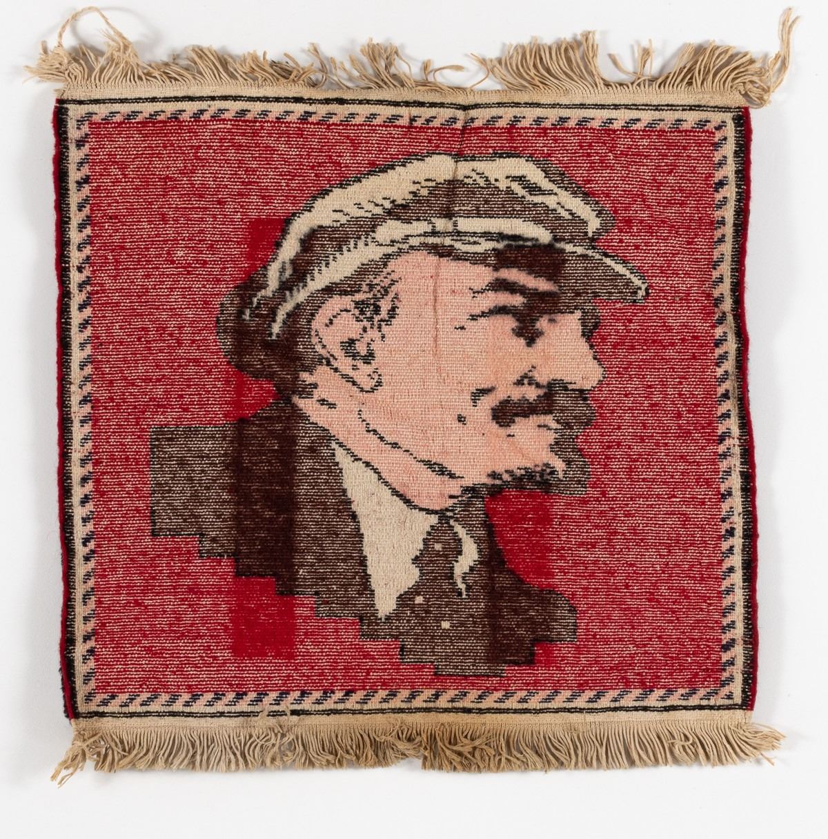 Woven tapestry of Lenin on a blood red background. Included are eight Russian pins, a Puerto Rican Communist Party badge,etc. Tapestry is 20.25 x 19.5 inches.
