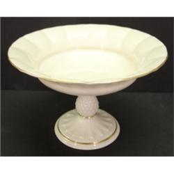 LENOX COMPOTE. Gilt decoration around rim. Marked on bottom "Lenox-Made in U.S.A." with crest and sticker on bottom reads "Hand Decorated with 24K gold". 6.75" H, 10.25" Dia.