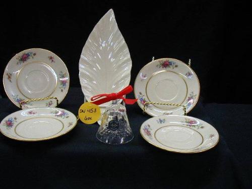 LENOX INCLUDES (1) 10 1/4in LEAF SHAPED DISH EXCELLENT, (4) SAUCERS FLORAL J-300 EXCELLENT, (1) FULL LEAD CRYSTAL BELL 3 1/2inT, 6 PC