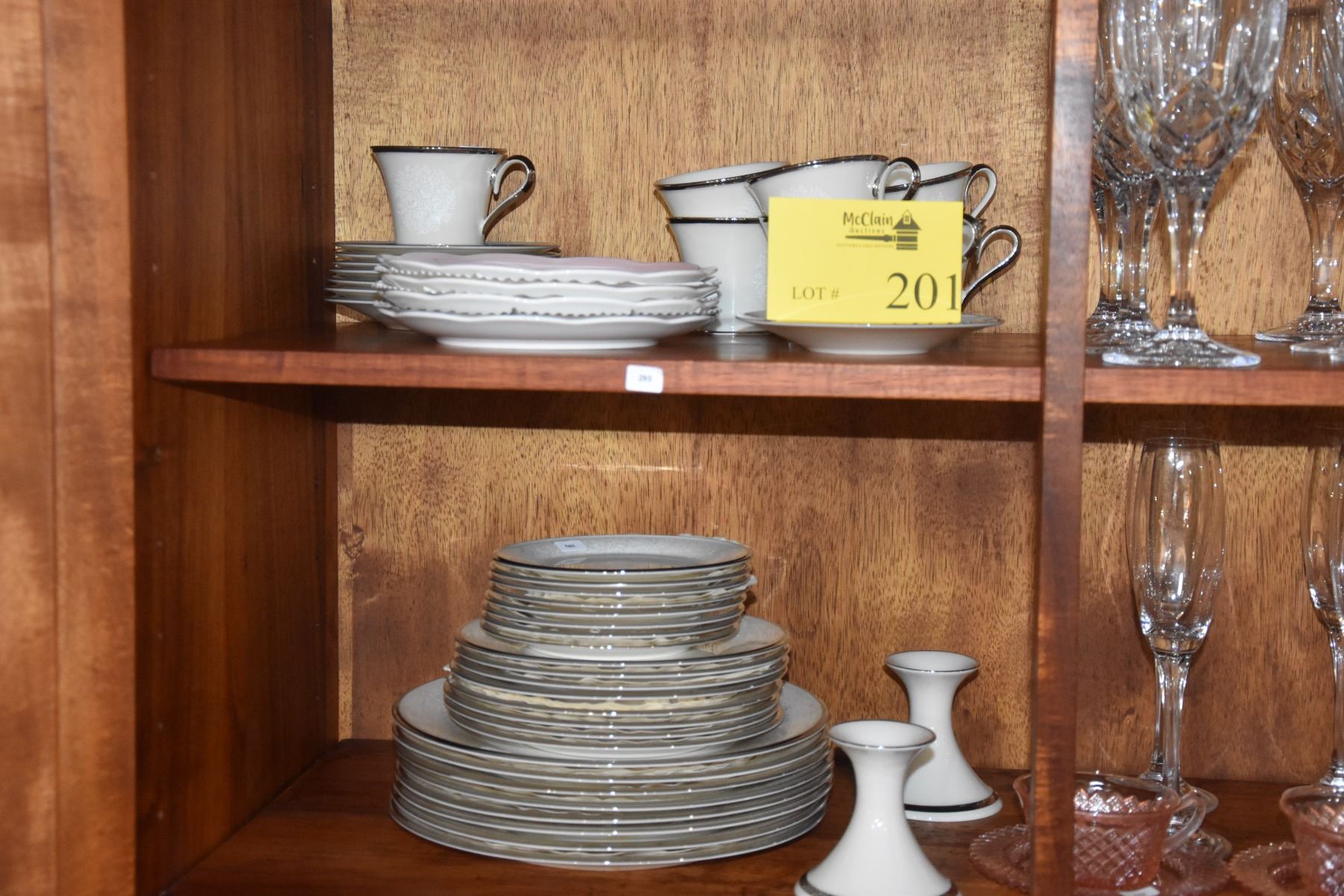 LENOX MOONSPUN CHINA PLATES, CUPS/SAUCERS (SERVICE FOR 8), CANDLE STICKS & LENOX BUTTERFLY PLATES (4) (46 PCS)