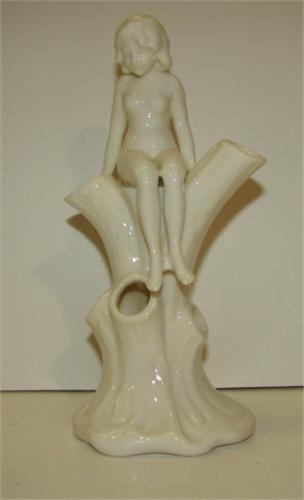 LENOX PORCELAIN FIGURAL BUD VASE. Depicts a nude girl sitting in tree. Marked on bottom with blue Lenox wreath mark. 7.75” H