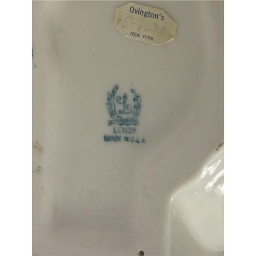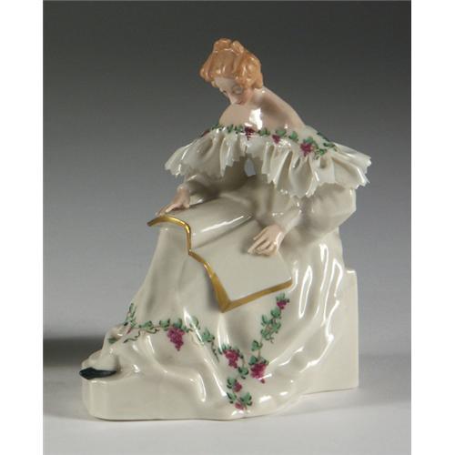 PORCELAIN: A Lenox porcelain figurine, a woman reading in a colonial style dress, hand painted grape vine detail on dress, 6'' x 4.5'' x 3'', hallmarked on underside with green Lenox wreath mark (1906-1953). Note: LOSS of lace in two place.