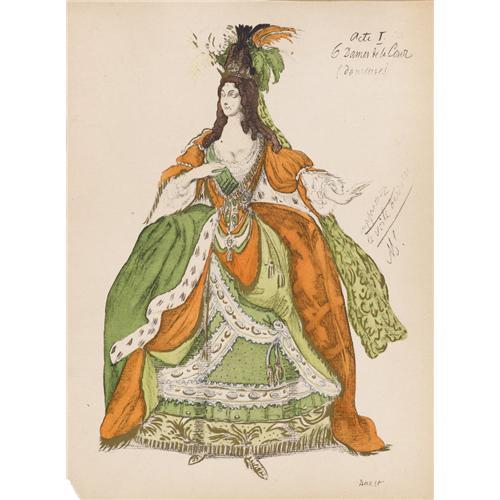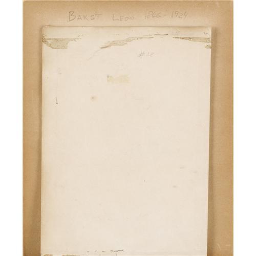 <B>LEON BAKST</B></I> (Russian 1866-1924)<BR><I>Medieval Prince</B></I> and <I>Dame De La Cour</B></I><BR>10 x 7 inches, sheet (25.4 x 17.8 cm) and 11-1/2 x 8-1/2 inches, sheet (29.2 x 21.6 cm)<BR>Watercolor and gouache on paper<BR>Signed lower right, each: <I>BAKST</B></I><BR><BR> <B>Condition Report:</B> normal wear with age, no restoration or significant damages<BR><BR><b>Shipping:</b> Requires 3rd Party Shipping (<a target="_blank" href="http://www.heritageauctions.com/common/shipping.php">view shipping information</a>)