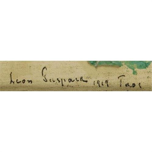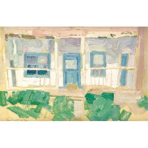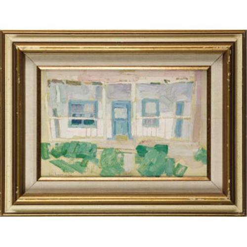 <B>LEON GASPARD (American, 1882-1964)</B></I><BR><I>Taos House</B></I>, 1919<BR>Oil on board<BR>8-3/4 x 13-1/2 inches (22.2 x 34.3 cm)<BR>Signed lower left: <I>Leon Gaspard / 1919 / Taos</B></I><BR> <BR>PROVENANCE:<BR>Mark Sublette, Medicine Man Gallery , Santa Fe;<BR>Harrison Eiteljorg Collection, Indiana.<BR><BR><B>Condition Report:</B> original condition, no paint losses, looks as though there is a sketch beneath the oil - review images online<BR><BR><b>Shipping:</b> Requires 3rd Party Shipping (<a target="_blank" href="http://www.heritageauctions.com/common/shipping.php">view shipping information</a>)