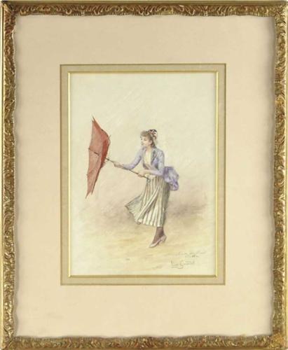 LEON GIRARDET (French 1857-1895). “MAID IN STORM WITH UMBRELLA”. This delightful watercolor on paper depicts a beautiful young French maid in a windy dilemma. The driving rain has inverted her umbrella. Signed in lower right, “Amon Adis Edward Wickham Leon Girardet”. Matted and framed in a simple gesso frame. SIZE: 11-3/4” h x 18-1/2” w. CONDITION: Generally very good. Frame has slight imperfection. 8-87351