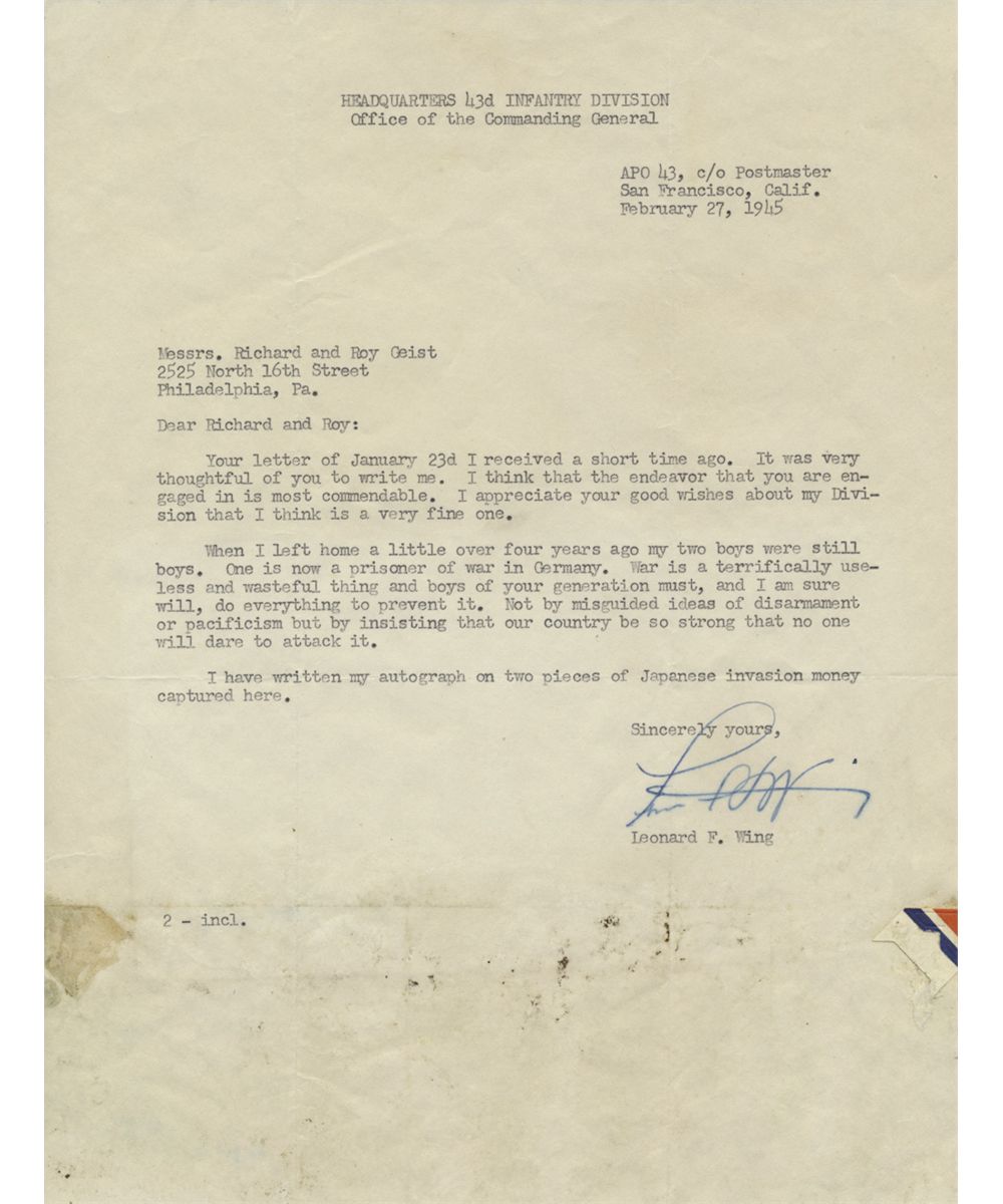 (1893-1945) Major general, Commander Army 43rd Infantry Division, named "Winged Victory". War-date T.L.S. 1p. 4to., Headquarters of the 43d Infantry Division, Feb. 27, 1945, to two boys collecting autographs. In part: "...When I left home over four years ago my boys were still boys. One is now a prisoner of war in Germany. War is a terrifically useless and wasteful thing and boys of your generation must, and I am sure will, do everything to prevent it. Not by misguided ideas of disarmament or pacifism by insisting that our country be so strong that no one will dare attack it...". Wing includes two pieces of Japanese invasion money, ten pesos each, signed by him adding rank. With original envelope, light staining to bottom, signatures on bills a bit light, overall very good condition.