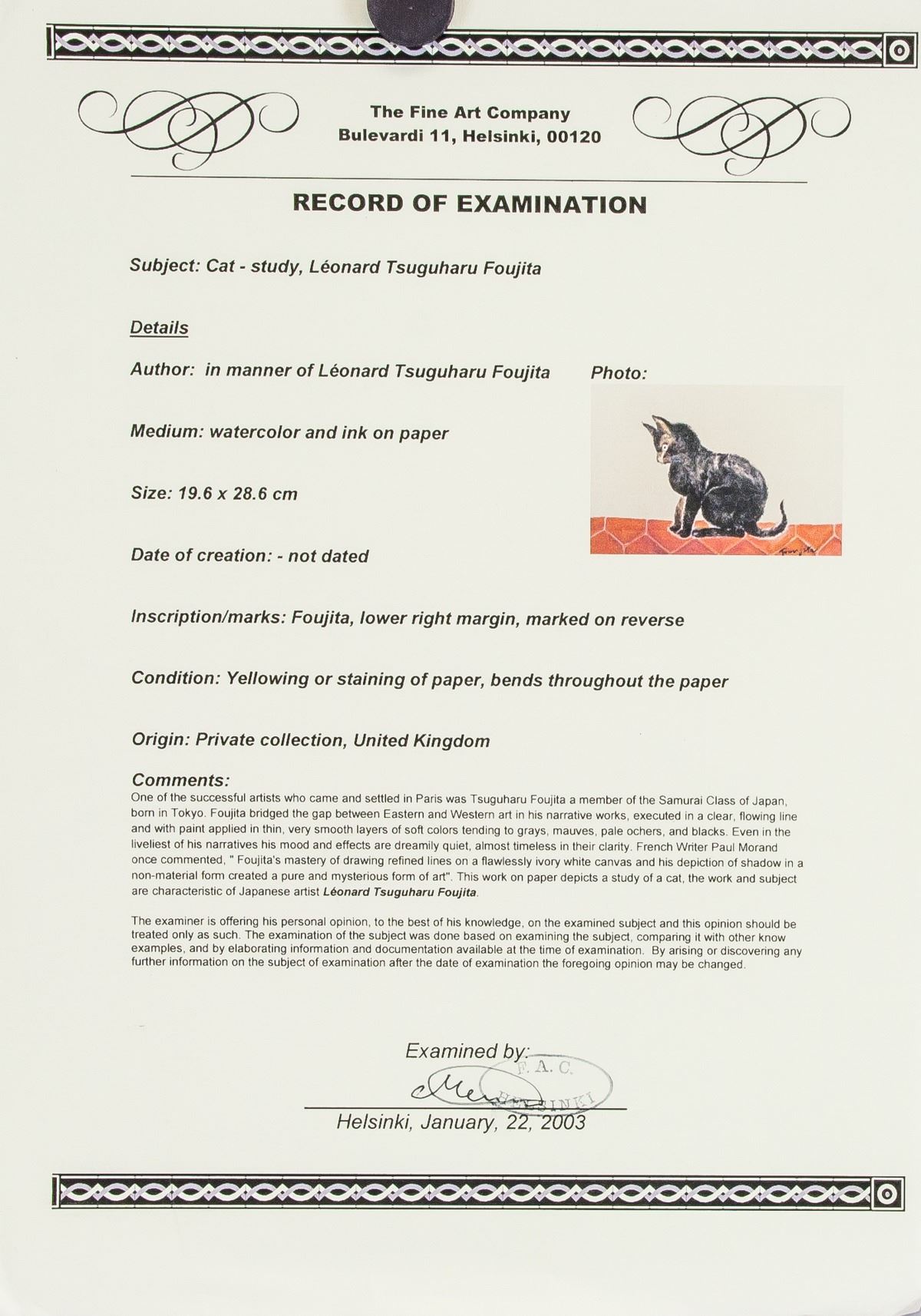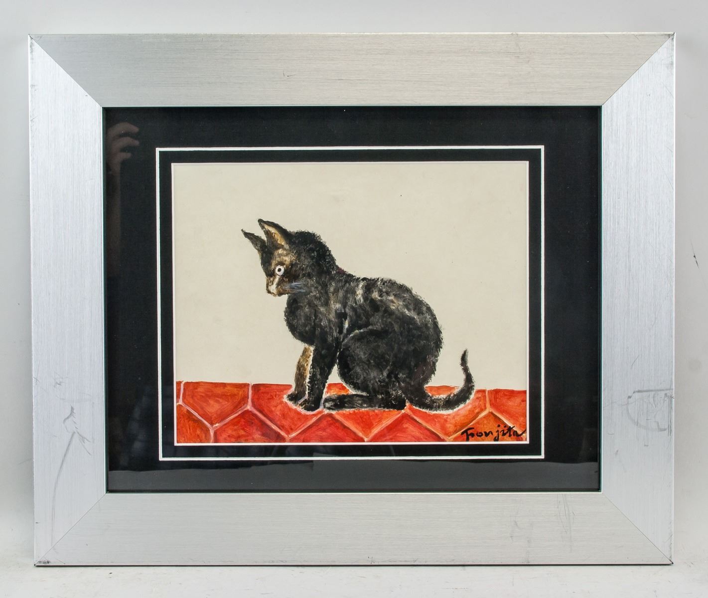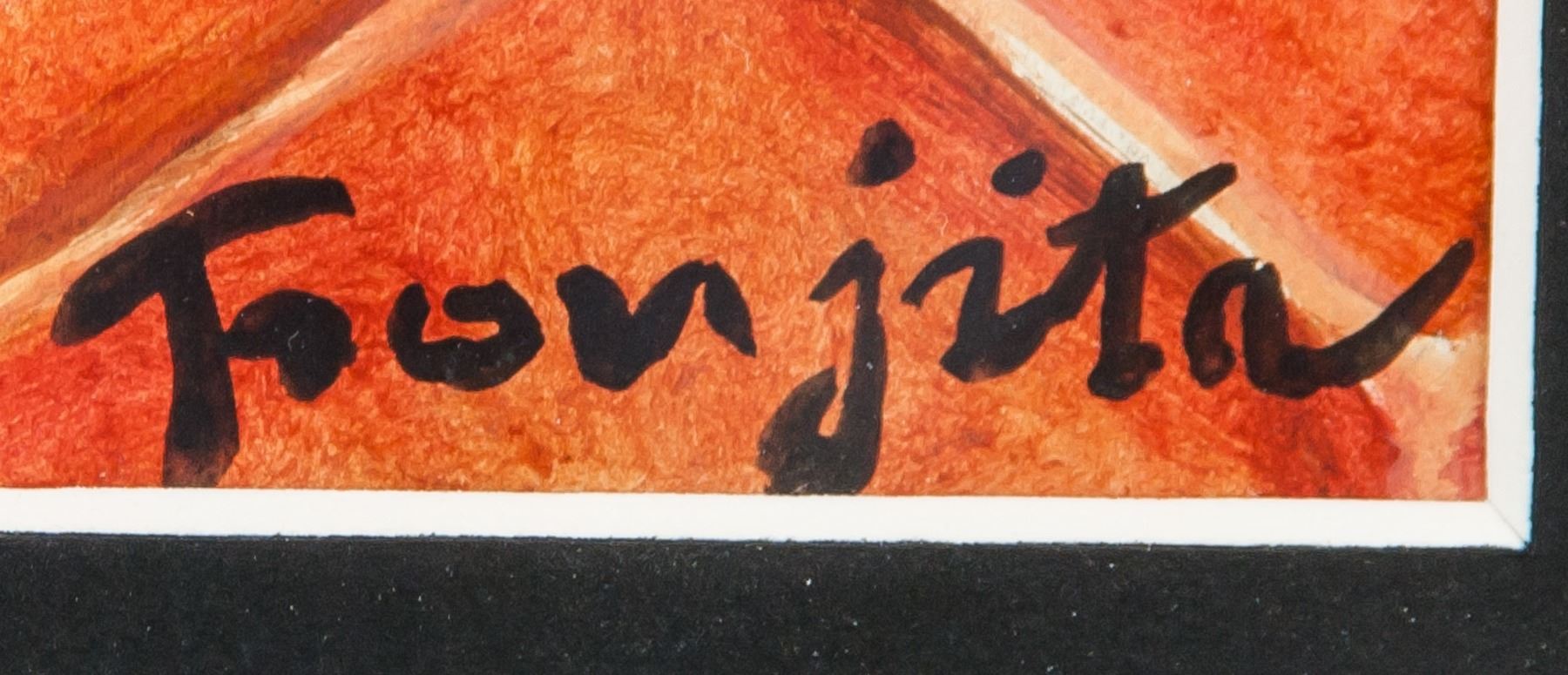 Mixed media on paper, watercolor and ink, framed. Featuring a cat on tiled floor. Signed and attr. Leonard Tsuguhara Foujita (Japanese, 1886-1968) on the lower right corner. Accompanied with a certificate of authenticity. 19.5 x 24 cm (7.7 x .9.5 inches). Frame size: 36.5 x 44 cm (14.3 x 17.3 inches). Leonard Tsuguharu Foujita was a Japanese painter best known for his participation in the bohemian culture during of the 1910s in Montparnasse, Paris. Foujita’s strange yet representational paintings often depict himself, cats, and women. He found nearly immediate success in Paris and, despite having no connections beforehand, Foujita was able to sell and live off his art. Born on November 27, 1886 in Tokyo, Japan, he went on to study at the Tokyo National University of Fine Arts and Music in 1910. After his move to Paris, Foujita met and became friends with prominent avant-garde artists of the day like Pablo Picasso, Henri Matisse, Amedeo Modigliani, and Chaïm Soutine. His work can now be found in the collections of the Art Institute of Chicago, the Metropolitan Museum of Art in New York, the National Gallery of Art in Washington, D.C., and the Los Angeles County Museum of Art, among others. Foujita died on January 29, 1968 in Zürich, Switzerland at the age of 81. PROVENANCE: Southern Ontario estate