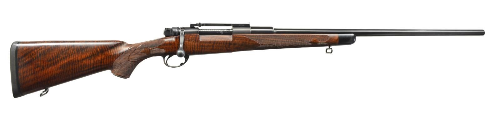 RIFLE. Cal. 270 Win. S# 15742. Bbl. 24 1/2" sightless of sporter weight w/ heavy diameter shank in chamber area. Finely built rifle using a military Mauser M98 action stocked by the Famous Leonard Mews of Appleton, Wisconsin. Mews worked for Weatherby in the late 1940's & early 50's & is credited w/ designing the Weatherby stock as it's known today. According to Roy Weatherby, Mews was his first & best stock maker ever. Features include custom bottom metal held by hex head screws, commercial single stage trigger, custom bolt shroud w/ M70 style safety & jeweled bolt body w/ elegant custom bolt handle for scope clearance. Receiver is equipped Leupold 1 piece scope base. Classic style cheekpiece sporter stock of exhibition Bastgone walnut w/ tight fiddle figure having dark brown & reddish tones. Forearm & wrist have extensive borderless ribbon spade pattern fine hand checkering. Stock features include black forearm tip, steel grip cap & Pachmayr flush mt. swivels. LOP: 13 7/8" over solid black Decelerator pad. Weight: 8 lbs., 3.4 oz. CONDITION: over 99% custom blue finish. Stock has very good oil type finish showing a few sm. scratches & marks. Crisp mechanics. Near excellent bore. (20-1916/DS). MODERN. $3,000-4,000.