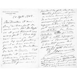 (1857 - 1919) Italian composer and librettist known for his 1892 opera Pagliacci. Very fine content A.L.S. "R. Leoncavallo" 4pp. 8vo., Parma, Sept. 20, 1902, in French to a "Director and friend", entirely about his most famous opera, Pagliacci! In part: "...How well I have done to see M. de. Reszke here and what work we have done! You will be delighted...with the modifications that he kindly made to the translation of the role of Canio. It is superb, and it gives me the illusion of hearing my Italian text! As soon as they have finished he will come to Paris bringing the water colors and Calabrian costumes...I would like you to say a word in Le Figaro that announces two things: first, that I have come expressly to reach an agreement with my famous interpreter M. Jean de Reszke on a matter of the translation of Paillasse [the French name for Pagliacci], and to study the modifications...Second, that the mayor of Monalto, the country where the original drama took place, has ordered...from Mr. Rocco Ferrari (the celebrated Calabrian painter) the maquettes of authentic costumes from 35 years ago, and an exact reproduction of the alley of the Church where the itinerant theatre was set up during the festival...the opera will be an authentic reconstruction of Calabria such as it was at that period...". Pagliacci opened in 1892, but despite its enormous popularity, it was not performed in Paris until 1902. Boldly written and very good.