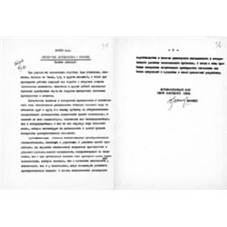 (b. 1934) Russian cosmonaut, the first man to walk in space. Very fine content T.Ms.S. 3pp. large 4to., [n.p., n.d. but bearing an approval by a censor dated Oct. 12, 1967], his notes in Russian for a report loosely translated as "The perception of space in space" describing general ideas for his lecture. The manuscript reads loosely in part: "... It is important to study the questions of perception by man of space in outer space because it is necessary to know about it when controlling the spaceship (when approaching, meeting, landing on the earth, moon and other planets), also during working operations outside the spaceship in open space (like carrying out construction welding and other works)...In these conditions the psychological impression of man about his position relatively of geometry of the spaceships cabin is “ruined”, so he must transfer to percept space only on bases of his visual ideas...Experiments carried out in conditions of short weightlessness, experience of orbital flights and cosmonauts’ coming out of spaceship in outer space, showed that man can adjust to perception of space in such unusual conditions…" Together with a short D.S. 1p. large 4to., [n.p.] Sept. 4, 1967 an affidavit that the intended speech will not reveal state secrets. Signed in red ink. File holes at left margins, very light age toning, otherwise very good condition.