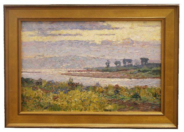 Original 1964 oil on canvas painting entitled "Early Morning on the White River" by Leonid Krul (Russian, 1923-1997). Measures 27 x 19.25 inches (framed: 33.25 x 25.25 inches). No visible signature to the painting.