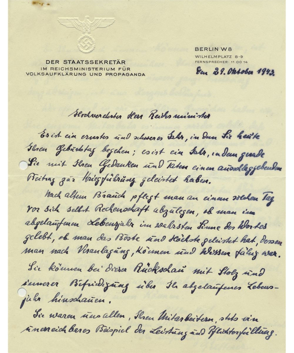 (1902 - 1996) Nazi official and politician, Secretary in the Reich Ministry of Public Enlightenment and Propaganda, a close confidante of Goebbels who introduced policies for the identification of Jews in Germany. Fine association A.L.S. on his official letterhead, 2pp. 4to., Berlin, Oct. 29, 1943 to Minister of Propaganda JOSEPH GOEBBELS. In part: "...this is a serious and difficult year in which you celebrate your birthday...a year in which you...contributed greatly to the war effort...it is custom on such a day to take account, to see if you really lived, to see if you did the best you could. You did and you can be proud and satisfied about the past year...you were a good example to all your employees...you assured us and you aroused us...". File holes at left, else very good.