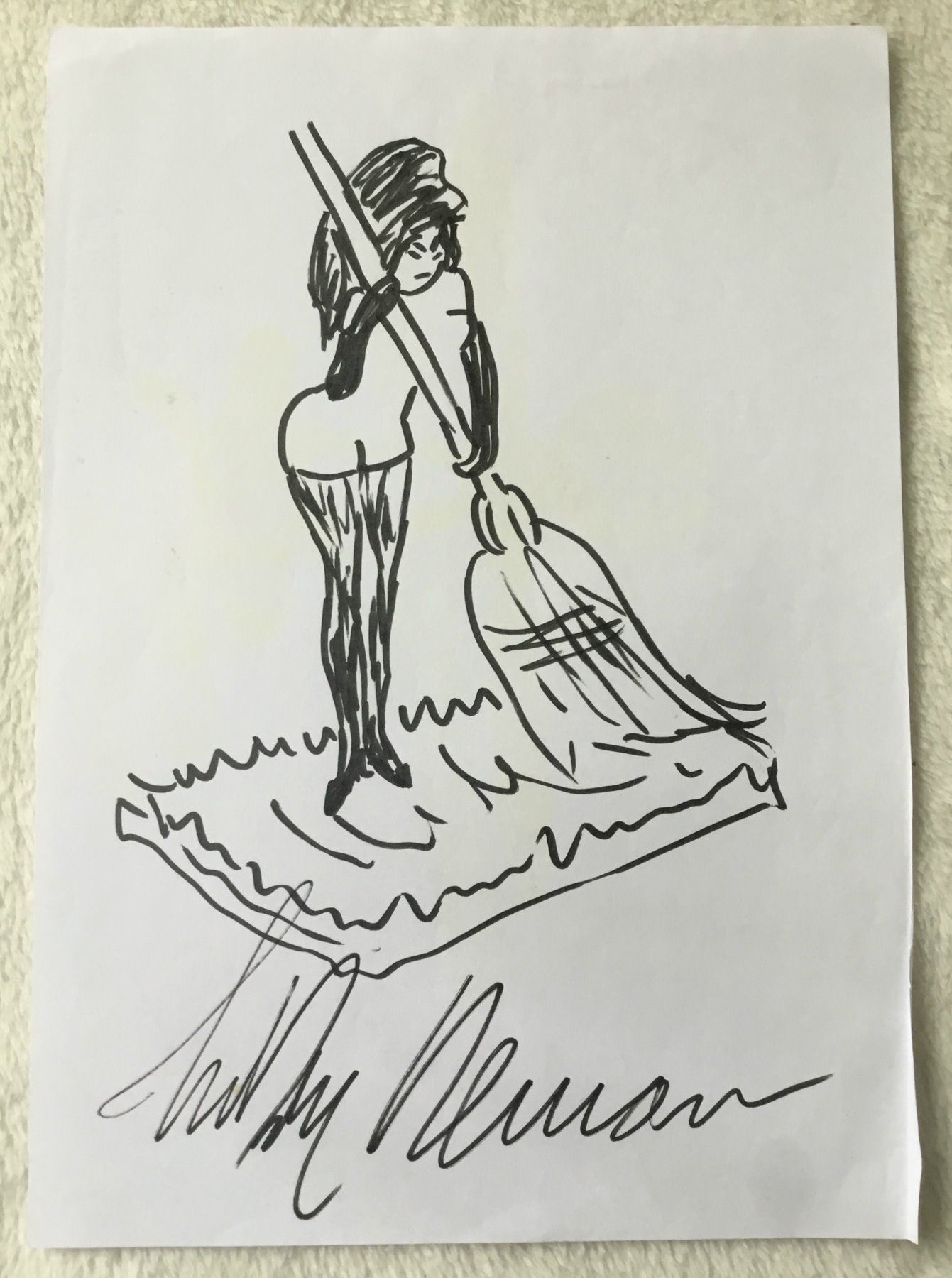 A drawing of a femling sweeping. A playboy quick sketch, signed by Leroy Neiman on A4 paper. The drawing has some yellow marks on the paper, and creasing.