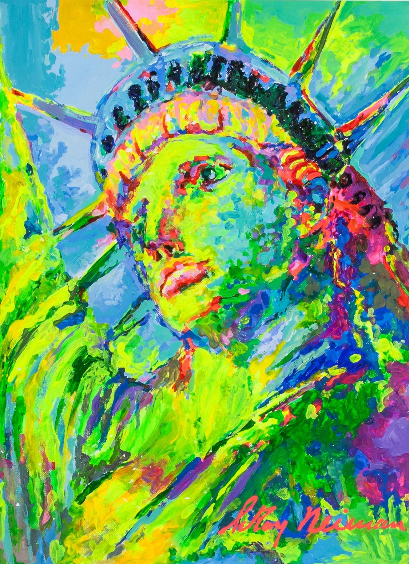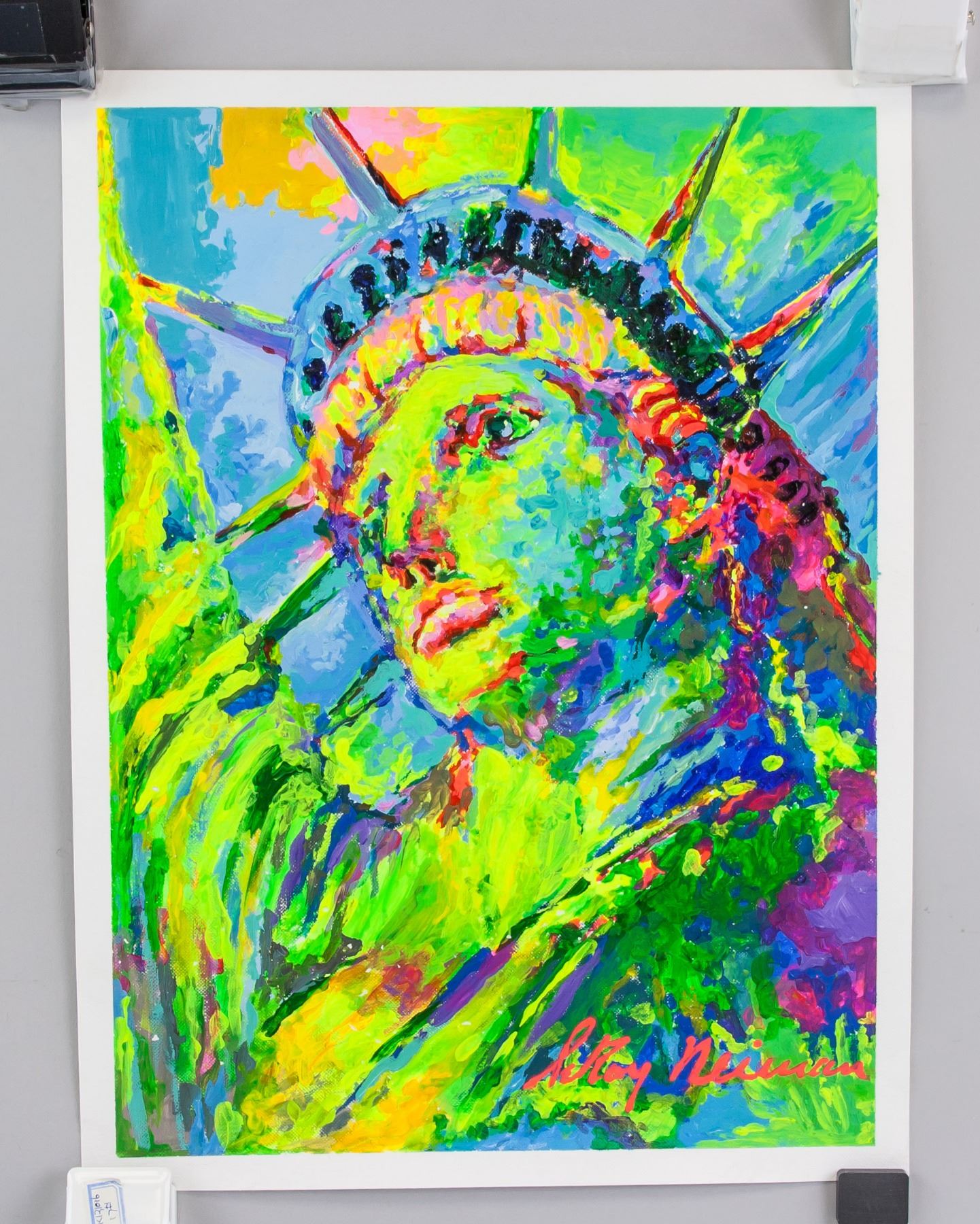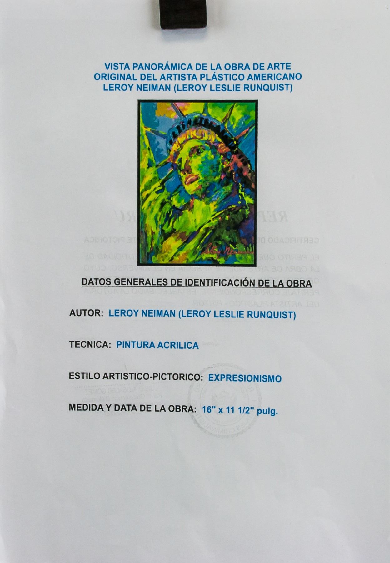 Acrylic on paper. Featuring the Statue of Liberty. Signed and attr LeRoy Neiman (American, 1921-2012) on the lower right corner. 16 x 11 in. (40.6 x 27.9 cm). LeRoy Neiman was an American artist who blended a Pop Art sensibility with impressionistic brushwork and vibrant color. “I do not depart from the colors borrowed from life,” he once said. “But I use color to emphasize the scent, the spirit, and the feeling of the thing I’ve experienced.” His prints and paintings of sporting events, leisure activities, and movie characters like Rocky were published in magazines such as Playboy. Born LeRoy Runquist on June 8, 1921 in St. Paul, MN, the painter enrolled briefly at the St. Paul School of Art and then at the Art Institute of Chicago after having served in the US military. During his life he sometimes performed on television, captivating audiences by drawing or painting portraits live on air. The prolific and popular artist donated a substantial donation to Columbia University School of the Arts in 1995, which helped to create its LeRoy Neiman Center for Print Studies. Neiman died on June 20, 2012 in New York, NY at the age of 91. Today, the artist’s works are held in the collections of the Art Institute of Chicago, the Smithsonian American Art Museum in Washington, D.C., and the Indianapolis Museum of Art, among others. Acquired from the father of the current owner, J. Ruzic. Ruzic’s involvement in the restaurant industry during his lifetime was of a national presence and awarded him the position on the Chicago & Illinois Restaurant Association as well as the National Restaurant Association. He toured Europe at their request (along with others) to help initiate training programs in the United States in the early and mid 1960's. Ruzic was also known for his Apple Strudel, which he sold retail through his restaurant and commercially to the White Hall & Tremont Hotels in downtown Chicago amongst others in the late 1950's and into the mid and late 1960's. The original Mayor Daily, Senator Dirksen, Mr. Hefner and Mr. Neiman were all customers amongst others. Arnie Morton was a friend and was the first Food & Beverage Director for Mr. Hefner's Playboy Club in downtown Chicago. Mr. Morton went on to run all the Clubs and eventually developed Morton's Steak House across the country (his son Peter went on to start Hard Rock Café). The current owner, J. Ruzic was the national president of a franchisee council who had Mr. Neiman design his first and only Neiman Jacket (as a high level give away for the Jimmy Connors Nuveen Challenge Event, which in the mid 1990's was Jimmy Connors answer to the tennis version on the Senior PGA Tour). As a result, the J. Ruzic met Mr. Neiman on many occasions. The photograph shows the Ruzic's with LeRoy Neiman (photograph is not included in the lot)