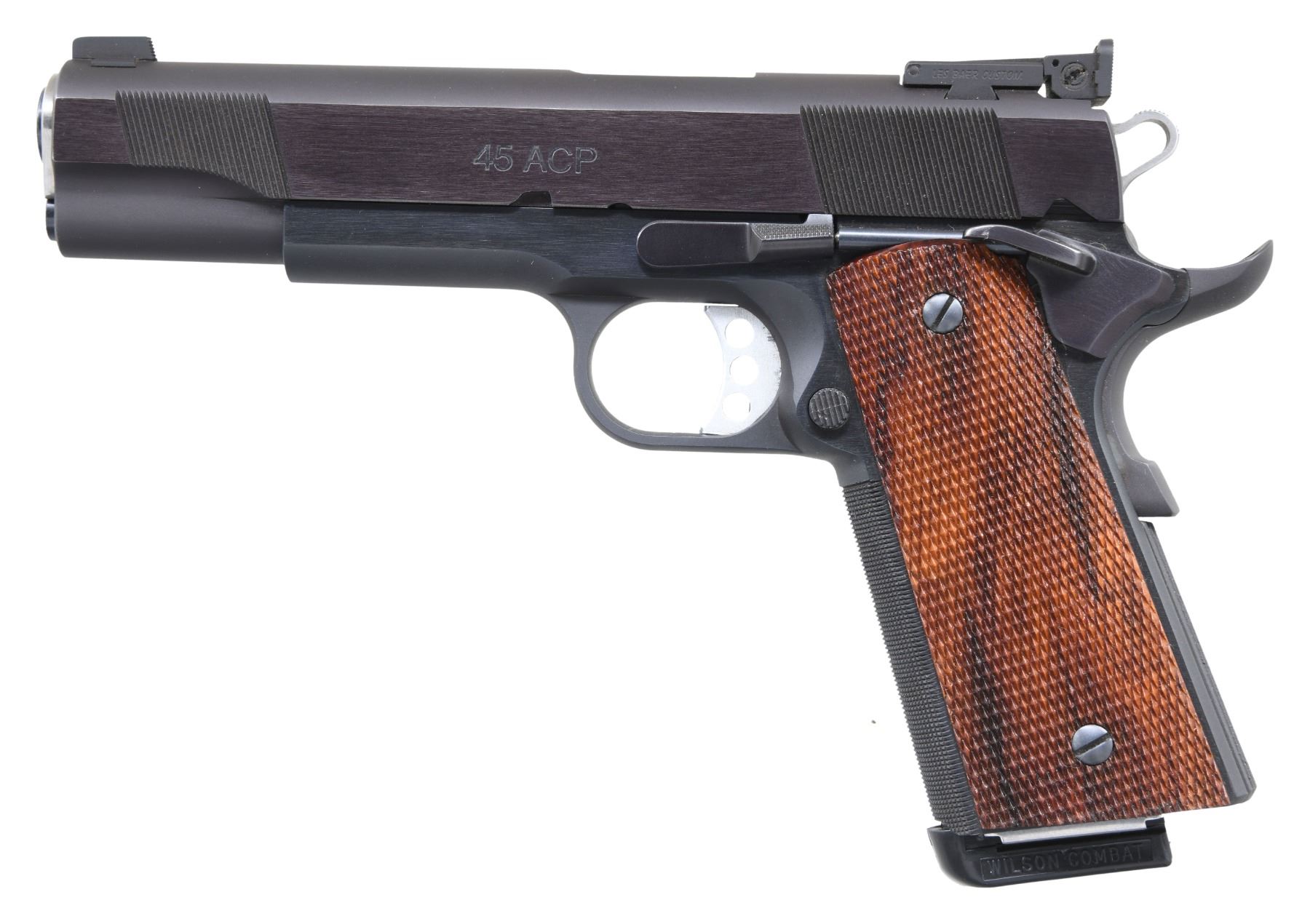 Cal. 45 ACP. S# LB32338. Bbl. 5". Blade front sight. Adjustable Les Baer rear sight. Le Claire, Iowa made Les Baer 1911 pistol. Front & rear slide serrations. Extended ambi safety. Stippled front grip strap. Extended beavertail grip safety. Blued finish. Checkered hardwood grips. MAGS: 1-8 rd. Wilson Combat made. UNATTACHED ACCESSORIES: AMS black softcase with bushing wrench & flat head screwdriver. CONDITION: all aspects near excellent. PROVENANCE: From the Estate of Jon Thomas, Gunsport, LTD. (25-1127/MJC). MODERN. $1750-2500.
