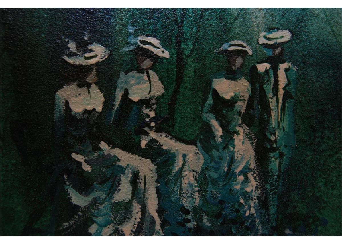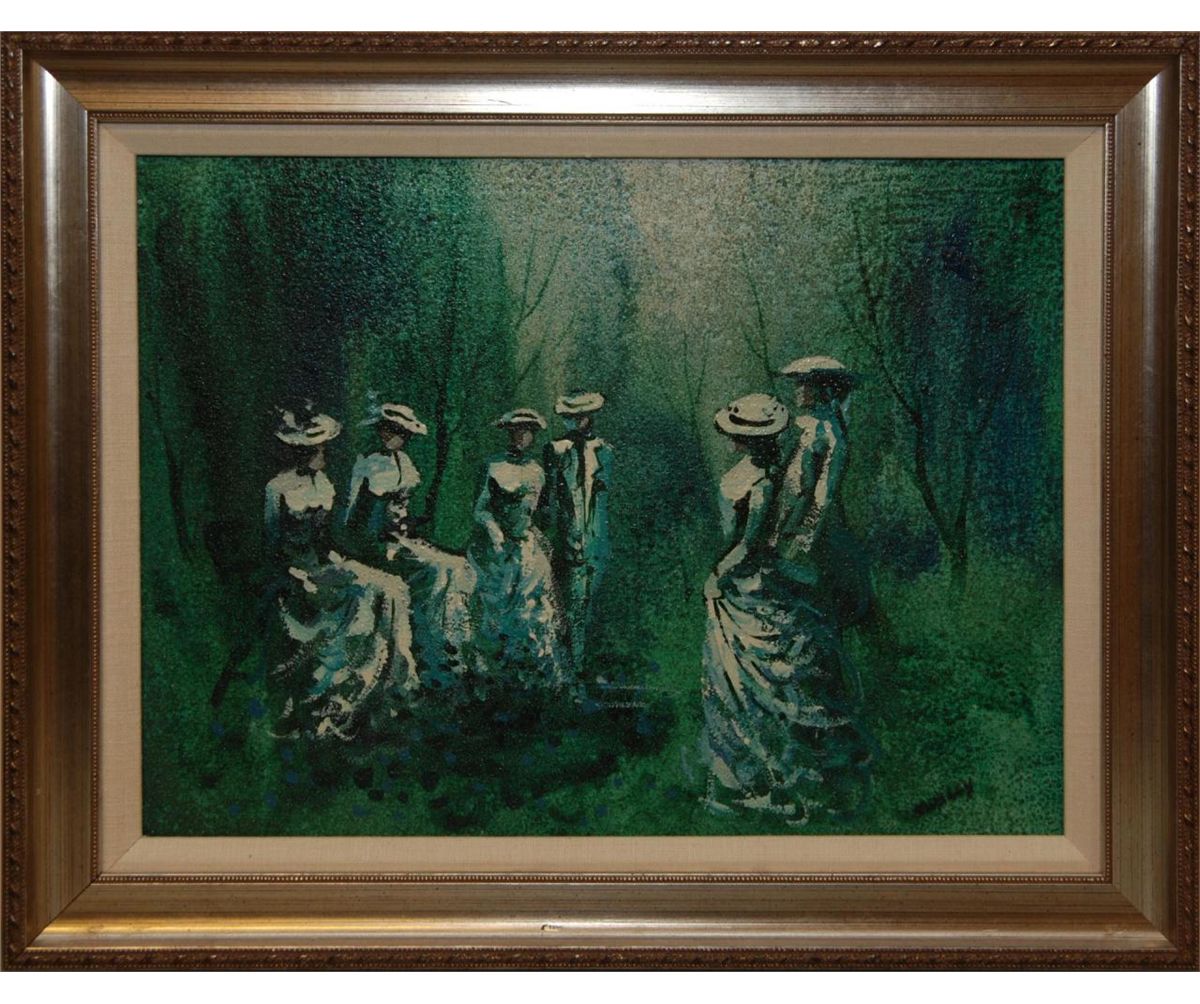 An oil painting on canvas depicting six standing women wearing white dresses in a green forest setting. Signed TWIGGY to lower right. Twiggy is the nickname of English model, actress and singer Lesley Lawson born in 1949. Set in gilded frame. Measures 12" height x 16" width + 2 1/4" frame (30.5cm x 40.6cm + 5.7cm. Provenance: Acquired by the estate directly from Twiggy as a gift.