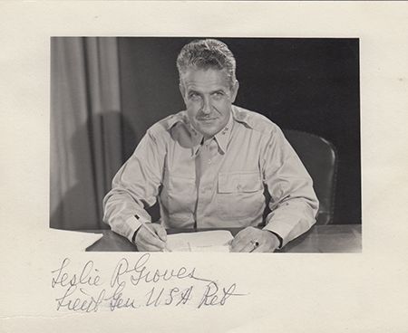(1896 - 1970) American general who, with Robert Oppenheimer, headed the Manhattan Project in the development of the first atomic bomb. S.P. 5 3/4" x 4 3/4" b/w, a chest, up pose seated at his desk, signed at bottom adding his rank. Sold with an A.N.S. "L.R.G." on his letterhead, 1p. 12mo., [n.p.], Mar. 9, 1970, sending the photo. Two pieces.