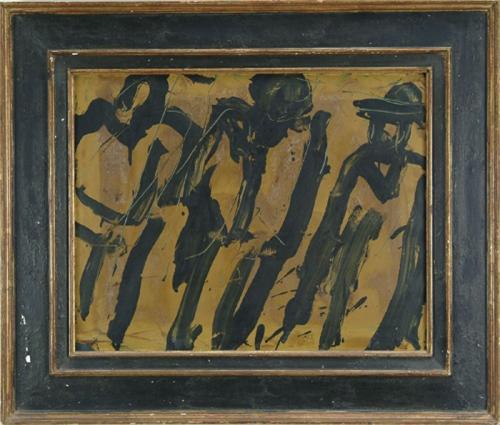LESTER F. JOHNSON (American, 1919-) "THREE COMRADES". Oil on canvas abstract scene shows three figures in black outline against a mustard brown background. Signed on reverse of canvas and dated 1964. Attached to stretcher are two old exhibit labels. One with title and artist from Martha Jackson Gallery, New York City. Other is from the Art Lending Service of the Museum of Modern Art. Also a copy of the invoice from the Martha Jackson gallery for this painting dated March 20, 1967. Housed in a partial gilt and black wide wood frame. SIZE: 16in. x 20in.. CONDITION: Very good. 9-26515