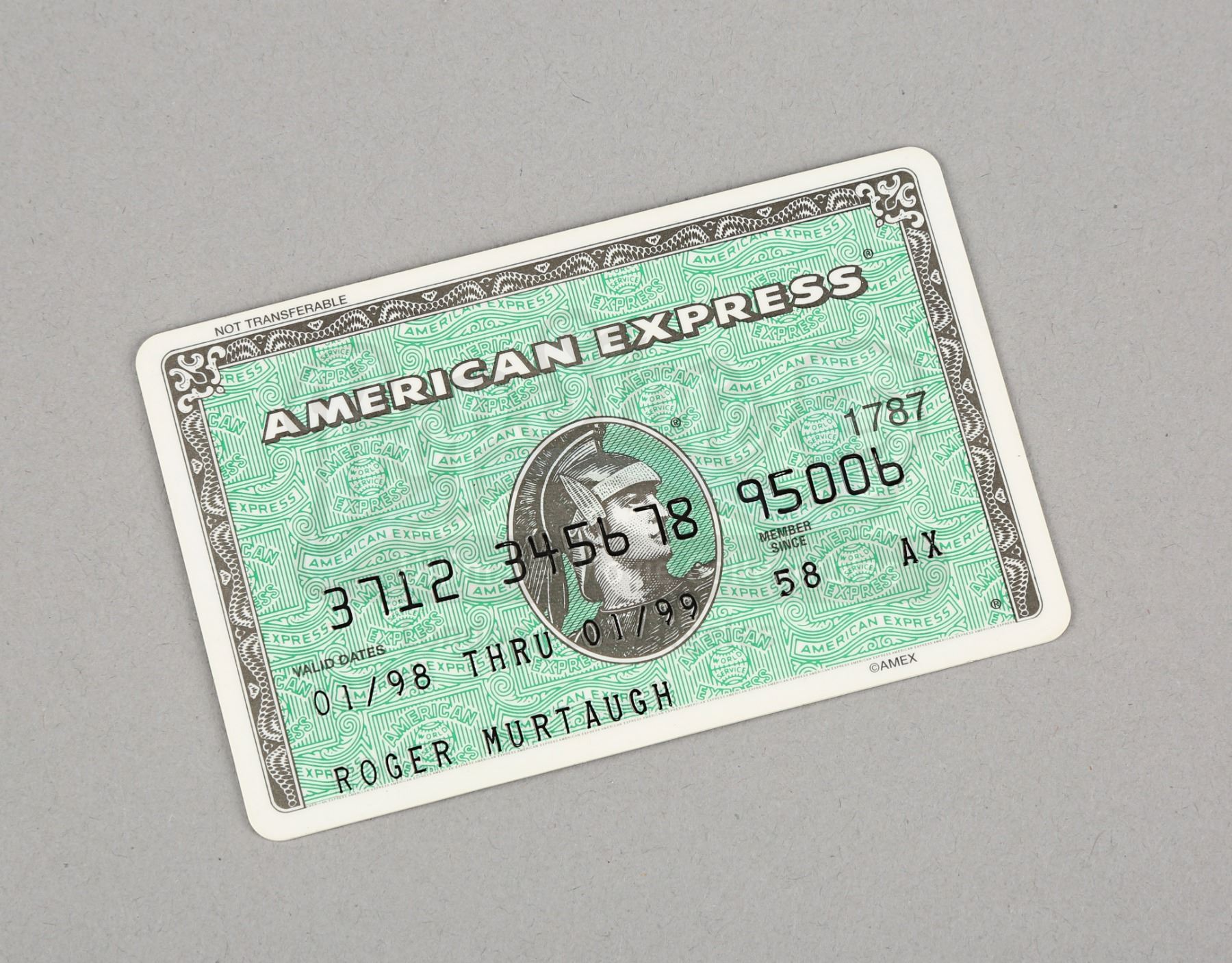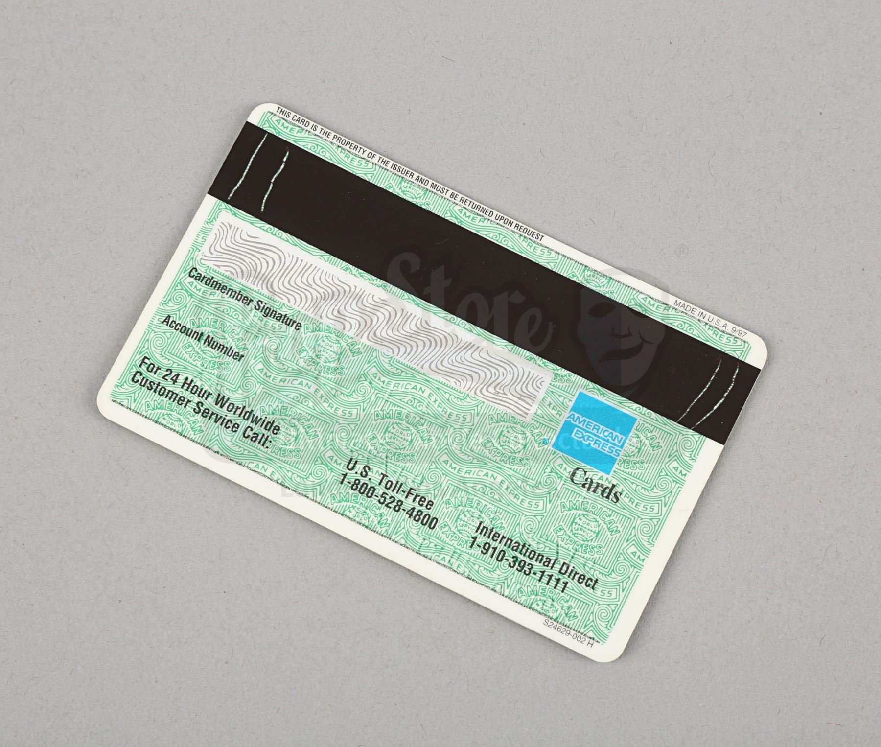 The badges are laminated card with a plastic-and-metal clip, each featuring a photo of their respective owner. The backs of the IDs feature unofficial character information, including a serial number and blood type. The credit card is plastic and features the name "Roger Murtaugh" at the bottom. These items are unseen in the final cut of the film. The credit card shows minimal wear, with a few scratches present on the black strip. Dimensions (badge): 10 cm x 9 cm x 2 cm (4" x 3 1/2" x 1"); (card): 8.5 cm x 5.5 cm (3" x 2")