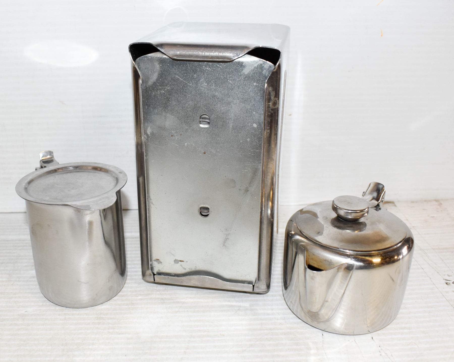 STAINLESS STEEL ONE CUP TEA KETTLE WITH FINGER LID AND A STAINLESS STEAL CREAMER WITH FINGER LID, BOTH APPROX 3.5 INCHES HIGH, AND STAINLESS STEEL SWAN NAPKIN HOLDER RESTAURANT STYLE