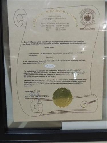 22X14 FRAMED LETTER ENVELOPE AUTOGRAPHED BABE RUTH COA. INCLUDES COA FROM AUTHENTIC AUTOGRAPHS UNLIMITED #F10925. AS SHOWN. VIEW PICTURE FOR DETAIL. PLEASE BE ADVISED, AND INFORMED REGARDING SIGNATURES OR AUTOGRAPHS THAT WE SELL AT AUCTION: WE ARE NOT AUTHENTICATORS, AND WE DO NOT AUTHENTICATE, OR VALIDATE ANY AUTOGRAPHS OR SIGNATURES THAT WE OFFER AT AUCTION. SOME AUTOGRAPHS OR SIGNATURES MAY COME WITH AN AUTHENTICATION FROM ANY ONE OF LITERALLY HUNDREDS OF AUTHENTICATORS ACROSS THE COUNTRY, AND AROUND THE WORLD. WE DO NOT ENDORSE ANY AUTHENTICATOR, NOR DO WE GUARANTEE THAT ANY AUTOGRAPH OR SIGNATURE IS AUTHENTIC, OR THAT IT WILL PASS AUTHENTICATION BY ANY AUTHENTICATOR. ALL AUTOGRAPHS OR SIGNATURES ARE SOLD
