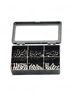 An assortment of the most often used Torx(R) base and ring screws" in both black and silver. The black polymer box's sections keep the various sizes separate and organized.