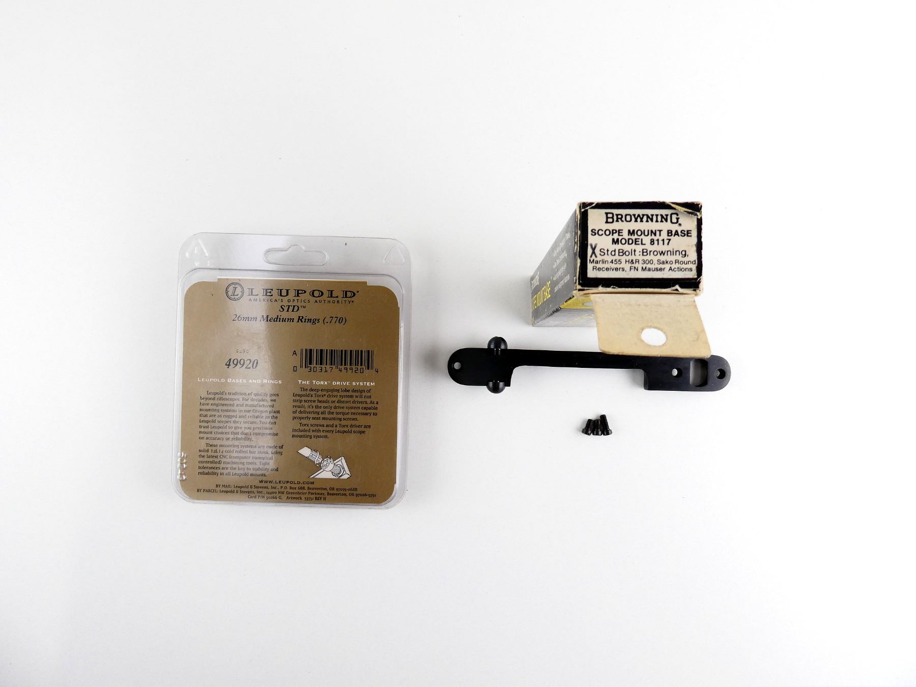 LOT INCLUDES; (1) SET OF LEUPOLD 1" SCOPE RINGS, BLACK STEEL, PART #: 49920, APPEARS NOS IN ORIGINAL PACKAGING, MAY NOT BE COMPLETE & (1) SET OF BROWNING SCOPE MOUNT BASES, BLACK STEEL, PART #: 8117, STANDARD BOLT, APPEARS NOS IN ORIGINAL PACKAGING, MAY NOT BE COMPLETE. MAY REQUIRE FITTING. SEE PHOTOS.