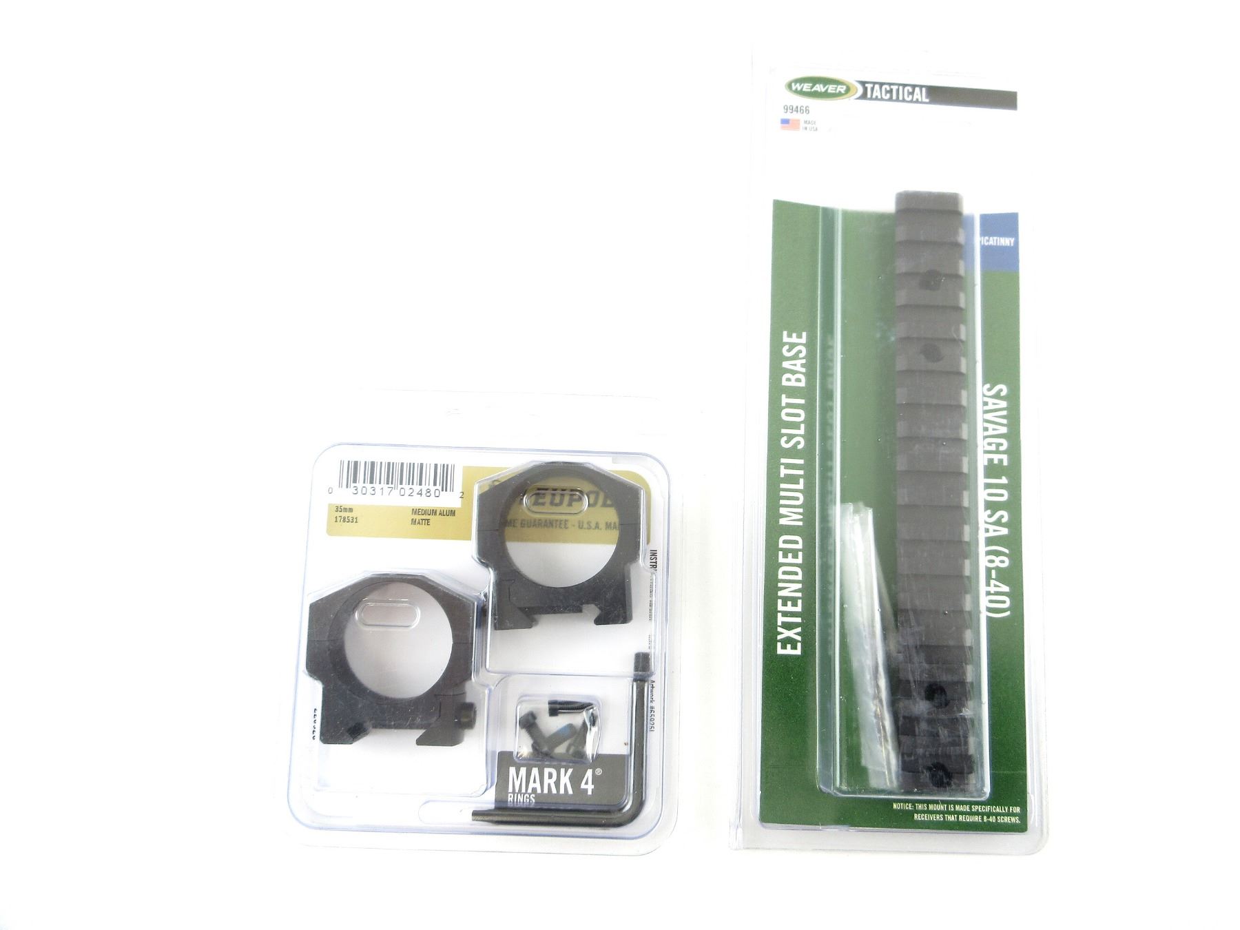 LOT INCLUDES; (1) SET OF 35MM MARK 4 SCOPE RINGS, BLACK MATTE ALUMINIUM, MEDIUM, PART #: 178531, APPEARS NEW OLD STOCK IN ORIGINAL PACKAGING & (1) SAVAGE 10 SHORT ACTION (8-40) EXTENDED MULTI SLOT BASE, BLACK ALUMINIUM CONSTRUCTION, PART #: 99466, APPEARS NEW OLD STOCK IN ORIGINAL PACKAGING. MAY REQUIRE FITTING. SEE PHOTOS.