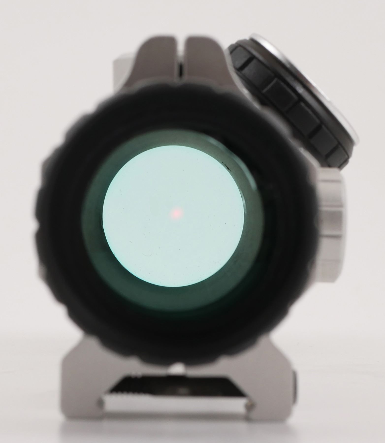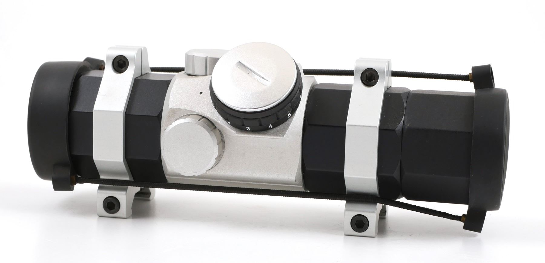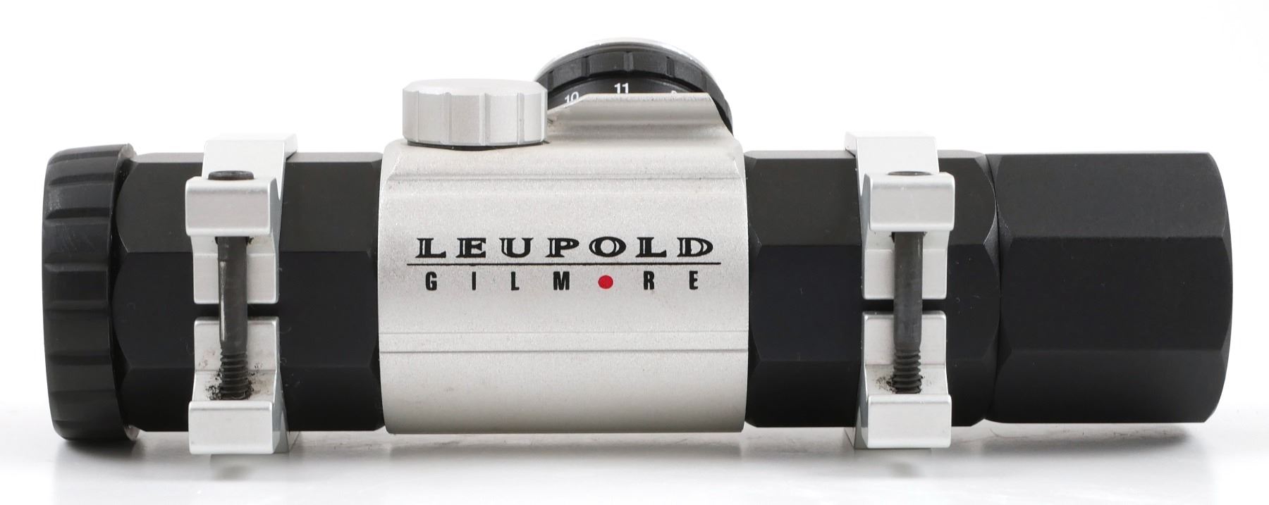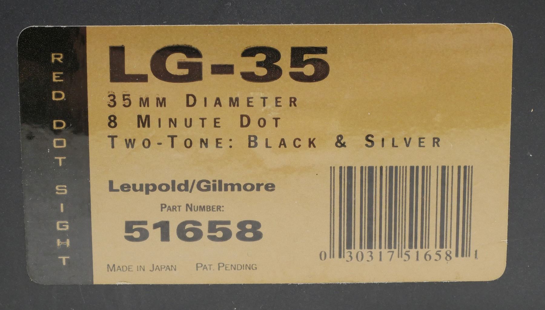 Leupold Gilmore LG-35 35MM Two-tone black & silver red dot sight part # 51658. 12 position dot intensity adjustment. 3000 candela super high output diode. Unlimited eye relief. 1/3 MOA precision click adjustments. Anti-Reflective lens coating for increased dot definition. In working order, light wear. Sight is able to be mounted on a rifle or pistol.