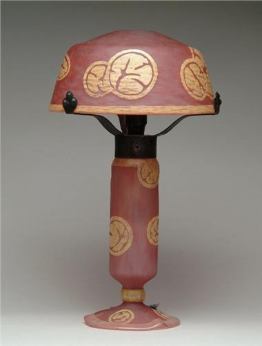 LEVERRE ART DECO LAMP. Very pretty Art Deco cameo lamp has cameo cut stylized flowers in circles done in mottled yellow glass against a frosted pink background. Signed on the foot "Leverre Francais". SIZE: Shade is 8 in. dia. Overall height is 14 in. CONDITION: Missing screws on collar, otherwise very good. 5-61355