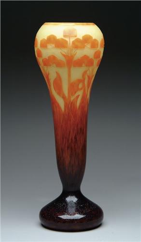LEVERRE ART DECO VASE. Very fine Leverre vase has Art Deco stylized cameo flowers. The flowers are done in a bright orange glass that shades to tortoise shell at the base. The bright orange flowers are set against a lovely yellow mottled background. Inscribed on the foot "Leverre Francais". SIZE: 17-3/4 in. t. CONDITION: Very good to excellent. 5-61374