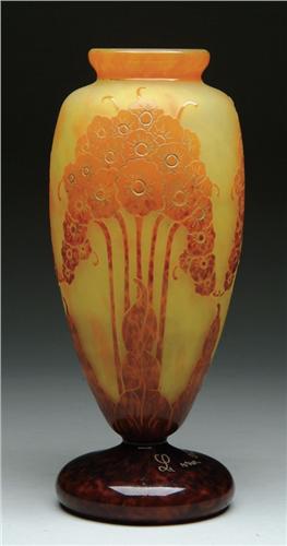LEVERRE ART DECO VASE. LeVerre vase features floral cameo decoration in colors of brown and orange over a citron mottled background. Signed on the foot "LeVerre Francais". SIZE: 12-3/4 in. t. CONDITION: Very good to excellent. 5-60620