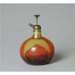 Lot 1272 LEVERRE FRANCAIS ATOMIZER. LeVerre Francais atomizer features stylized cameo leaves of orange and mottle brown against a yellow background. Brass atomizer top has plunger pump. Signed on underside "LeVerre Francais". SIZE: 5-1/2" t. CONDITION: Very good to excellent. 5-70020 (500-700)