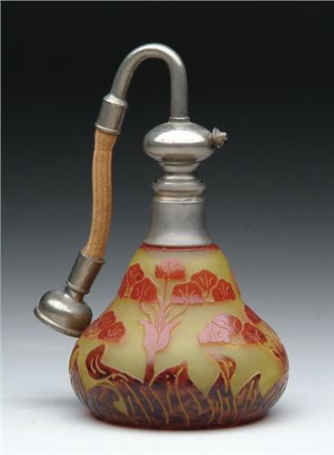 LEVERRE FRANCAIS ATOMIZER. Nice Art Deco atomizer has stylized flowers and leaves in a tortoise shell glass against a frosted yellow background. Signed on the underside "Leverre Francais". Bottle is topped with original atomizer assembly. SIZE: 6-1/2 in. t. CONDITION: Missing the atomizer bulb, otherwise very good to excellent. 5-61231