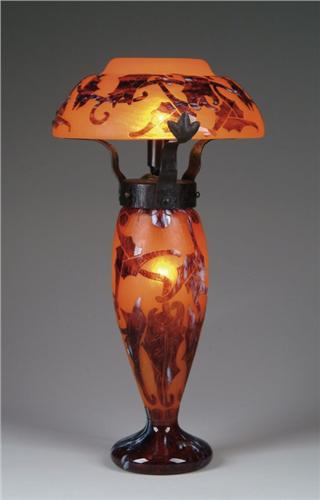 LEVERRE FRANCAIS LAMP. Outstanding Art Deco cameo lamp has wonderful stylized cameo leaves and vines done in a tortoise shell glass against a vivid orange background. Signed on the base "LeVerre Francais France". SIZE: 16 in. t. CONDITION: Lamp has been rewired, otherwise very good to excellent. 5-61071