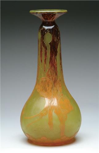LEVERRE SNAIL VASE. Outstanding Leverre vase has cameo cut snails on limbs against a frosted citrine background. Snails and limbs are done in a mottled orange glass shading upward to tortoise shell. Signed on the bottom with embedded candy cane and inscribed "France". SIZE: 15-1/4 in. t. CONDITION: Very good to excellent. 5-61376