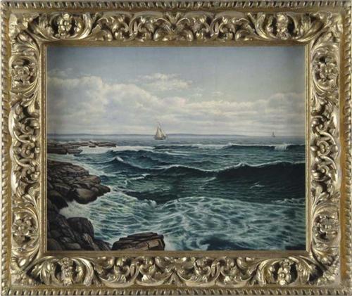 LEVI WELLS PRENTICE (American, 1851-1935) SEASCAPE. Oil on canvas coastal scene shows two sailboats on a green ocean with waves hitting a rocky shoreline. A long piece of land is seen on horizon under a cloud and blue sky. Signed on center bottom rock "LW Prentice". Housed in a fine heavy gesso decorated gilt period frame. Godel & Co Fine Art label affixed to back. SIZE: 15" x 19". CONDITION: Very good, inpainting. 9-27923