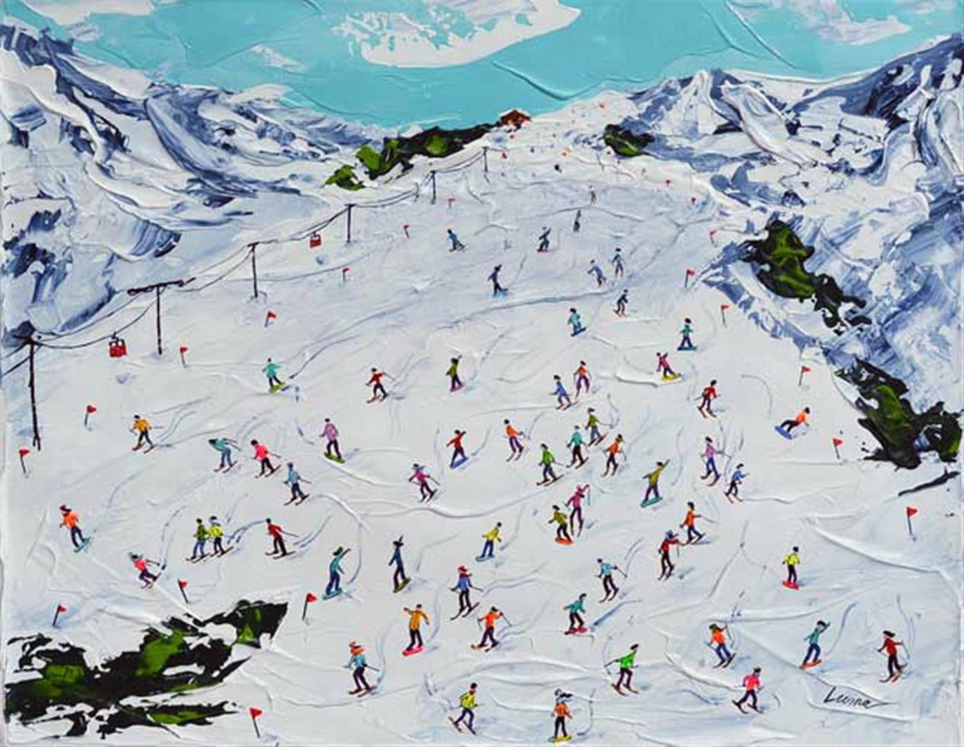 Artist: Lisa Levina - Title: Fun on the Mountain - Medium: Original Acrylic on Canvas - Signature: This one-of-a-kind work is hand-signed by the artist at the bottom of the image - Image Size: Approximately 16 inches x 20 inches - Unframed on Unstretched Canvas - Details: This work comes with a Certificate of Authenticity - Biography: Lisa Levina was born in 1995 in Russia, in the capital city Moscow. Lisa studied in the Serov Drawing Academy in Moscow and later in The Moscow Art and Industry Institute. - In 2019 Lisa immigrated to Israel and now lives near the sea in Bat-Yam, a small city near Tel Aviv. - Lisa enjoys staying on the beach for it is a huge influence on her naïve art. -