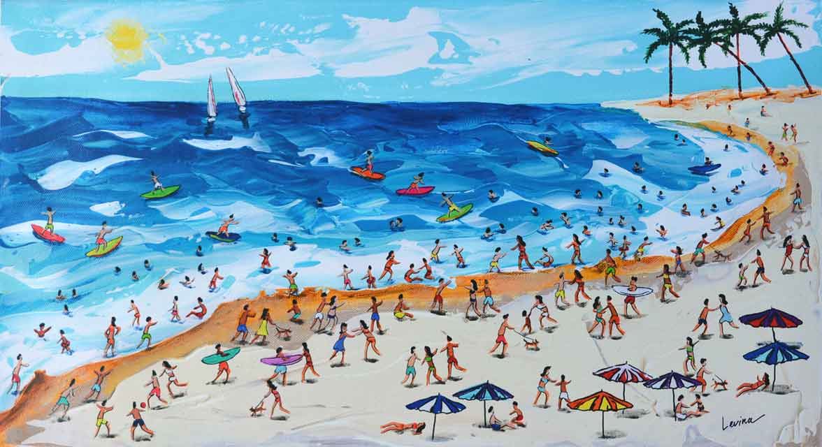 LEVINA **UNTITLED ** SIGNED. Artist: Lisa Levina - Title: Untitled - Medium: Giclee on Canvas - Signature: Hand-signed by the Artist - Limited Edition: 45 - Image Size: Approximately 11 ¼ inches x 20 ¼ inches - Framed: Unframed on Unstretched Canvas - Details: This work comes with a Certificate of Authenticity - Biography: Lisa Levina was born in 1995 in Russia, in the capital city Moscow. Lisa studied in the Serov Drawing Academy in Moscow and later in The Moscow Art and Industry Institute. - In 2019 Lisa immigrated to Israel and now lives near the sea in Bat-Yam, a small city near Tel Aviv. - Lisa enjoys staying on the beach for it is a huge influence on her naïve art. - Warranty: Item GUARANTEED to be as described