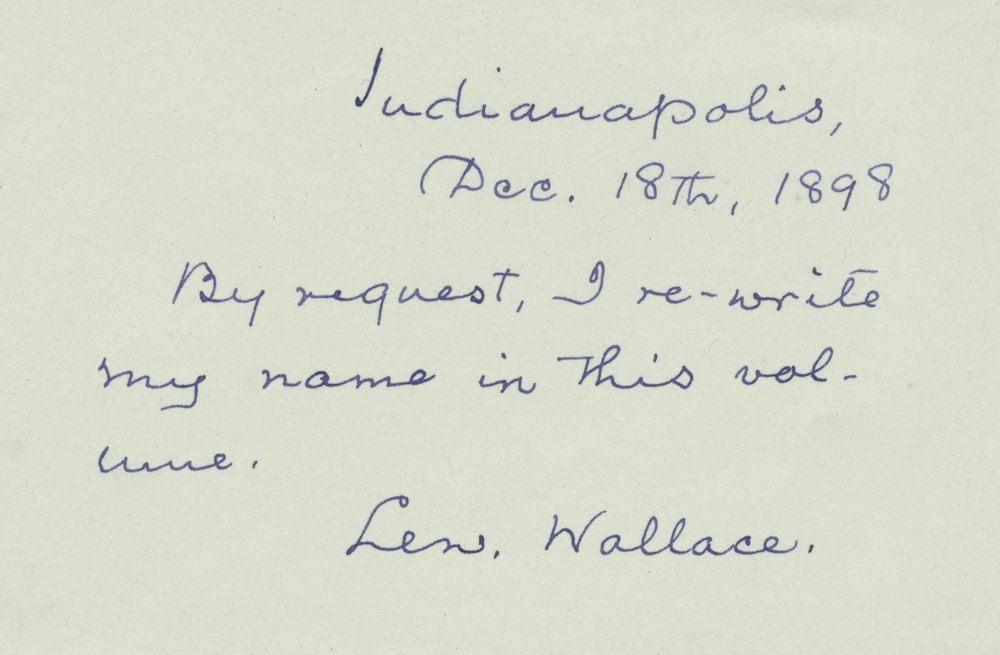 (1827-1905) Union major general who saw action at Forts Henry and Donelson and was later criticized by Grant for his costly hesitancy at Shiloh. Wallace is also remembered as the author of Ben Hur. A.N.S. on a small sheet likely cut from a book: "Indianapolis Dec. 18th, 1898 By request, I re-write my name in this volume. Lew Wallace". Fine.
