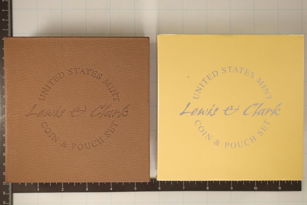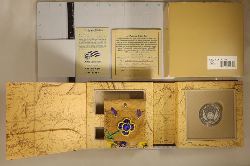 PROOF SILVER LEWIS & CLARK DOLLAR AND HANDMADE INDIAN BEADED HIDE POUCH, IN ORIGINAL US MINT PACKAGING WITH CERTIFICATES. CERTIFICATE FOR THE POUCH IS HAND SIGNED BY THE MAKER FROM THE CROW NATION IN MONTANA