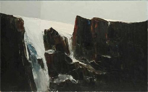 LEWIS SCOTT CROFT (American, 1911-) SNOW COVERED CLIFF. Oil on masonite modern scene shows dark rocky cliff with sections of snow and ice. Signed lower left "Croft". Unframed. Croft was born in Nova Scotia but worked and lived on the North Shore of Massachusetts and was represented by Christopher Gallery in New York City. SIZE: 15" x 24". CONDITION: Very good. 9-29166