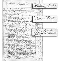 A fine grouping of at least twenty documents signed by various men who served during the Lexington alarm contained in a 139 page account book, legal folio, [Hingham, Mass.] 1775- 1796. The signers include: LEVI BURR (Drummer), JESSE SPRAUE, ELISHA LANE, THEOPHIUS CUSHING, JOSEPH CUSHING, (Lieutenant Colonel, Brigadier), JOHN BAYLEY, EDWARD WILDER (Sergeant), SETH CUSHING (Major), NATHANIEL LINCOLN (2nd. Lieutenant), SAMUEL BURR, NATHANIEL CUSHING, CHARLES CUSHING (Lieutenant Captain), JOHN BURR, JR., ISAIAH CUSING (Col. in Lincoln Regiment), THOMAS JONES, JR. (Sergeant), JOHN CUSHING (Colonel), JOSHUA BARKER, AMOS SPRAGUE (Corporal), NEHEMIAH RIPLEY, and JOSHUA LORING. Besides containing the scarce signatures of these patriots, the account book offers something even more important: a glimpse into their daily lives. The owner of the account book was a merchant residing somewhere in the vicinity of Hingham for his accounts also include one for Major General Benjamin Lincoln (whose account is signed by his secretary), and from various place names mentioned. He actively traded in rum, tea, plows, wood, sugar, and other manufactured goods and also appeared to posses a substantial farm, workshop and owned part of a wharf. It appears that this merchant also supplied arms and accoutrements to the Continental Army: on the first page he sold in December 1775 Thomas Cushing "A Mount for a gun - 4s" he then charged 3s 4d for mounting the gun. In early 1776 he sold Hawke Fearing Jr., "A Sworde & Belt". He charges Isaiah Cushing 1-4-1 for "A Barr of Iron agreed for" and 6s for "Secting[?] of your accompt [?] for Cannon work &c." in July 1777. From the fall of 1776 through the summer of 1777, Caleb Loring purchased 2000 canteens for Massachusetts soldiers marching to Ticonderoga to stem the advance of Burgoyne. According to Hingham town records, Loring was chosen to arrange supplies for companies from Scituate and Pembroke while they were in Hingham. The town records also indicate that Hawke Fearing was paid 8d. for "Transporting Cannon to Hull" and under Fearing's account he charges 2s on Dec. 16, 1776 "Chair to Hull Charged to David Burr". It appears from this that the merchant also rented a cart to Fearing or the town, and sells Amos Sprague "29 1/2 dozen of Canteen Bootons [sic]". Further research will likely reveal many more connections and reveal much about the Minutemen and their world. Still in its original leather binding that shows much wear, spine and some pages loose, although the pages within are still quite clean, overall good to very good condition.