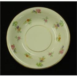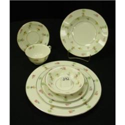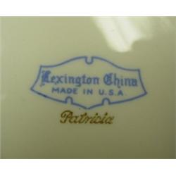 Lexington China "Patricia" pattern. USA made. Circa 1950's. Multifloral border. 84 pieces. Twelve 10.25" dinner plates, twelve 8" luncheon plates, ten 6.25" B&B plates, twelve 5.25" berry/sauce bowls, twelve 8" rim soups, seven 5.5" saucers, twelve 2.25" x 4" cups, 2.75" x 4.75" covered sugar, 3.5" x 4.25" creamer, 3.25" x 7" gravy, 3.5" x 8.75" covered vegetable bowl, 2.25" x 7" x 10" oval bowl and two 13" x 16.5" platters. Condition: Excellent