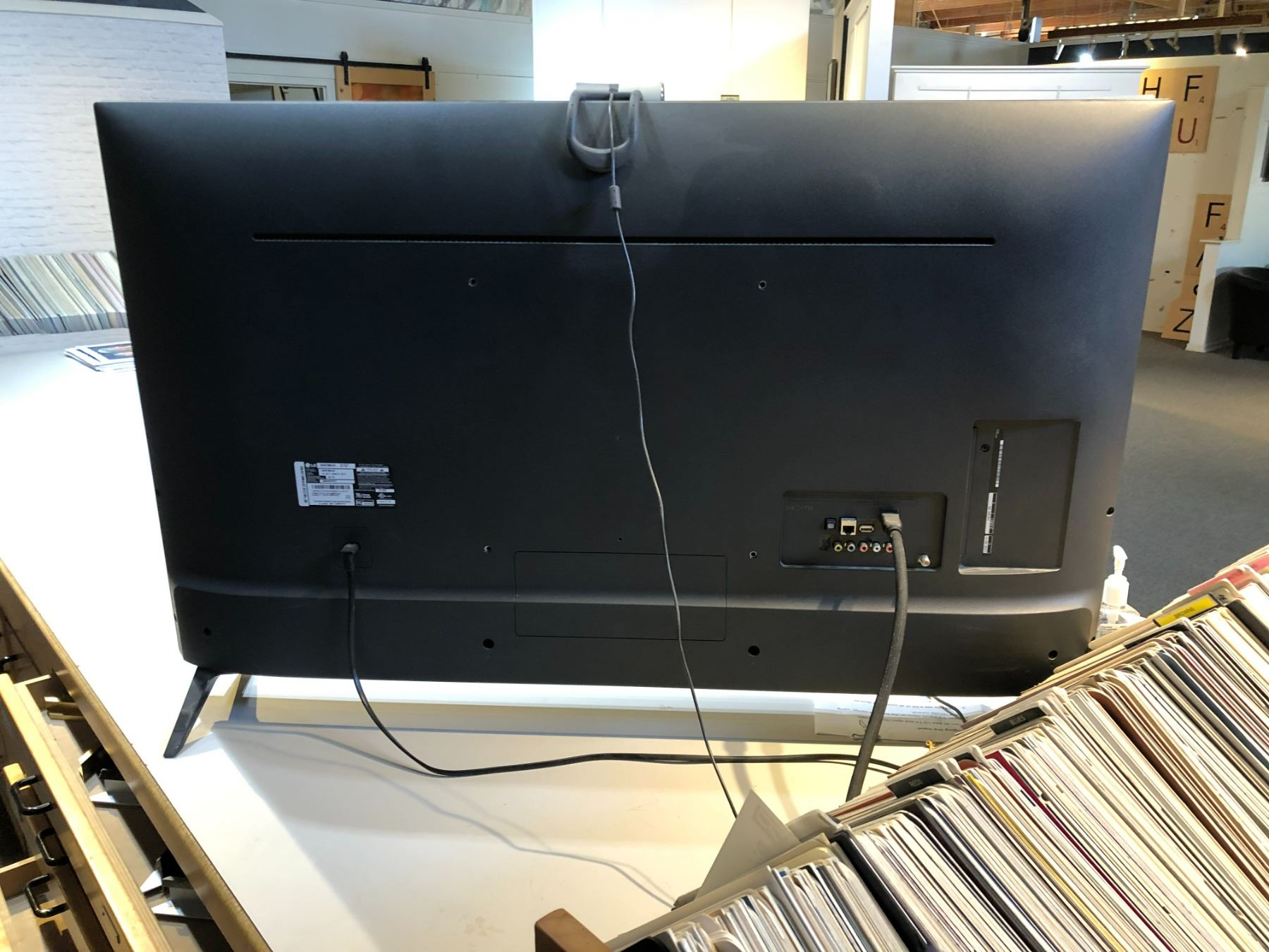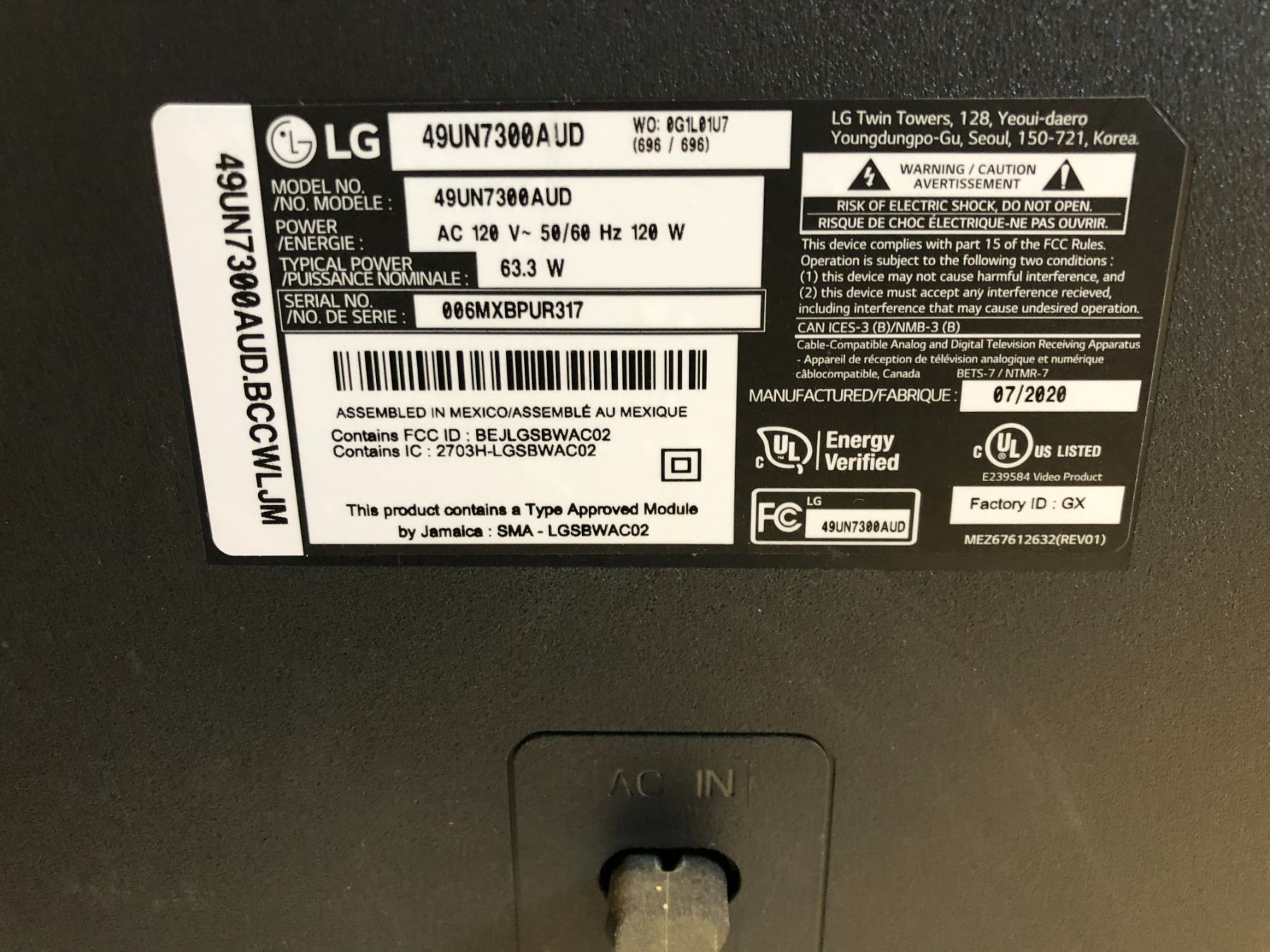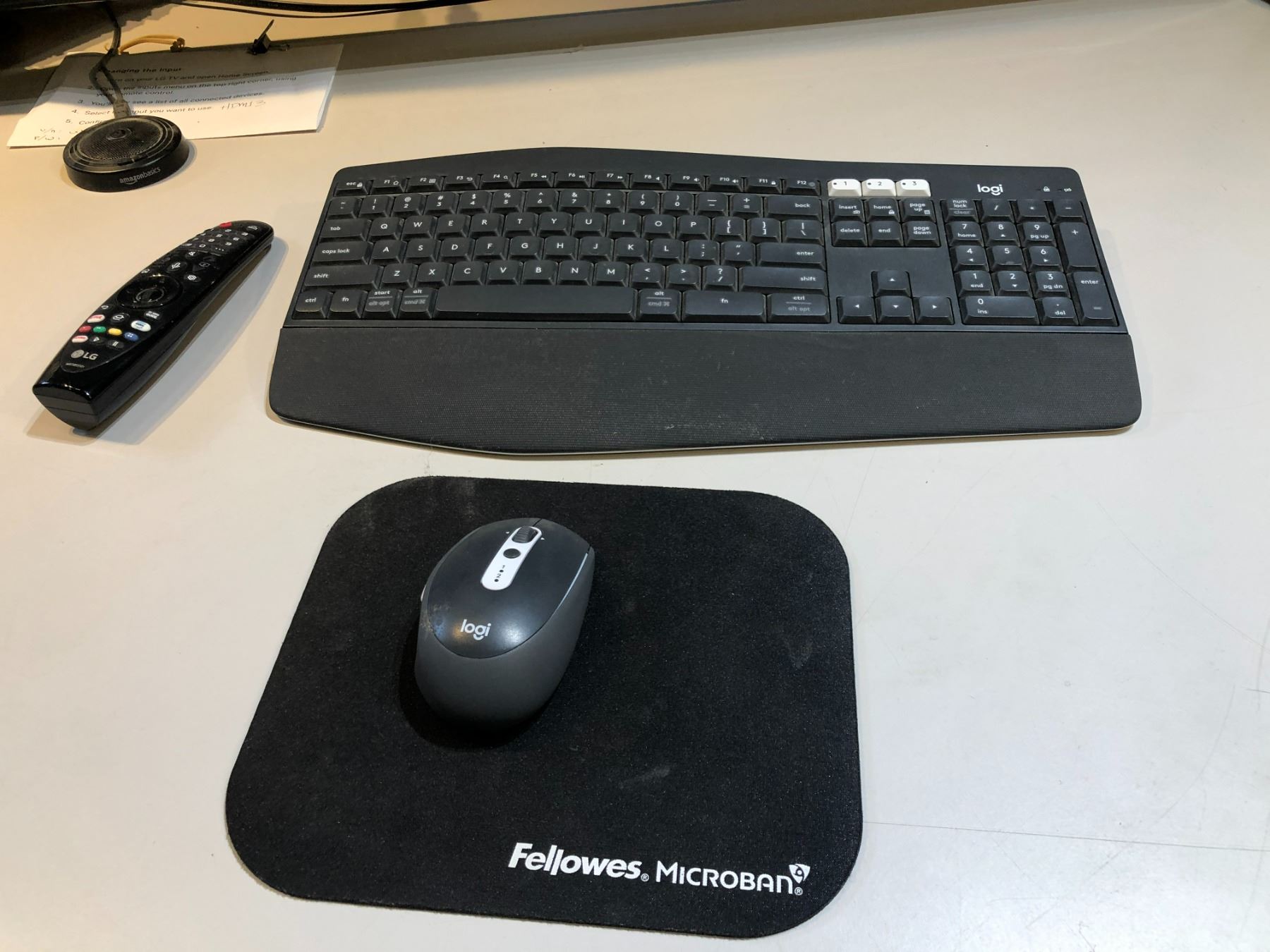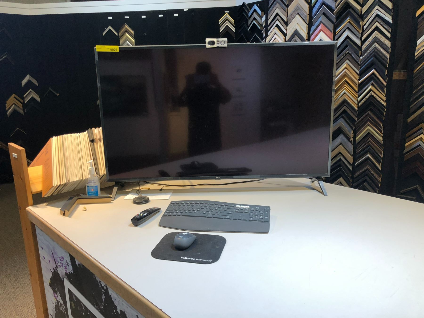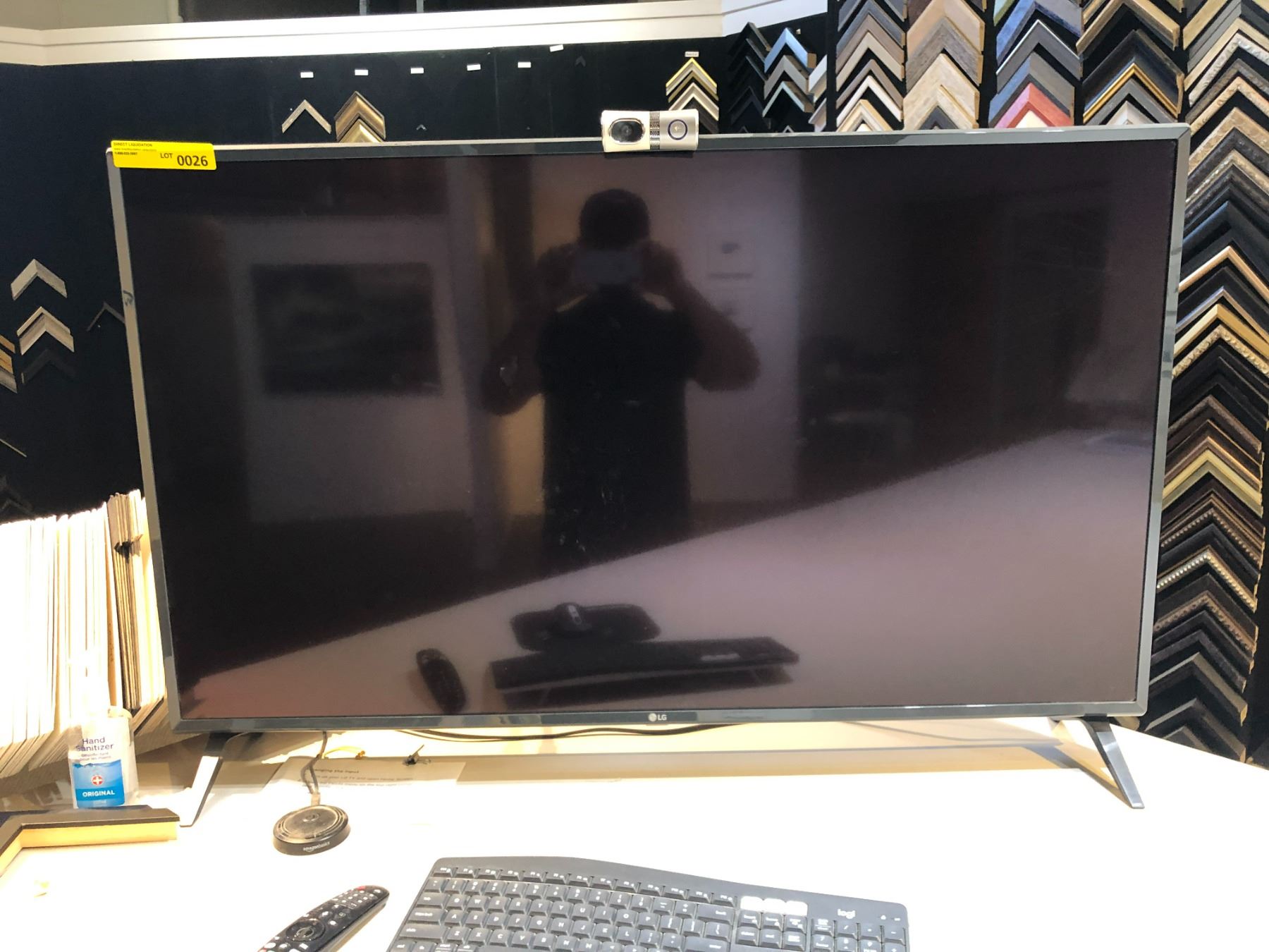 LG 49 inches Smart TV model 49UN73OOAUD, a Logitech mouse and keyboard, and a Logitech webcam