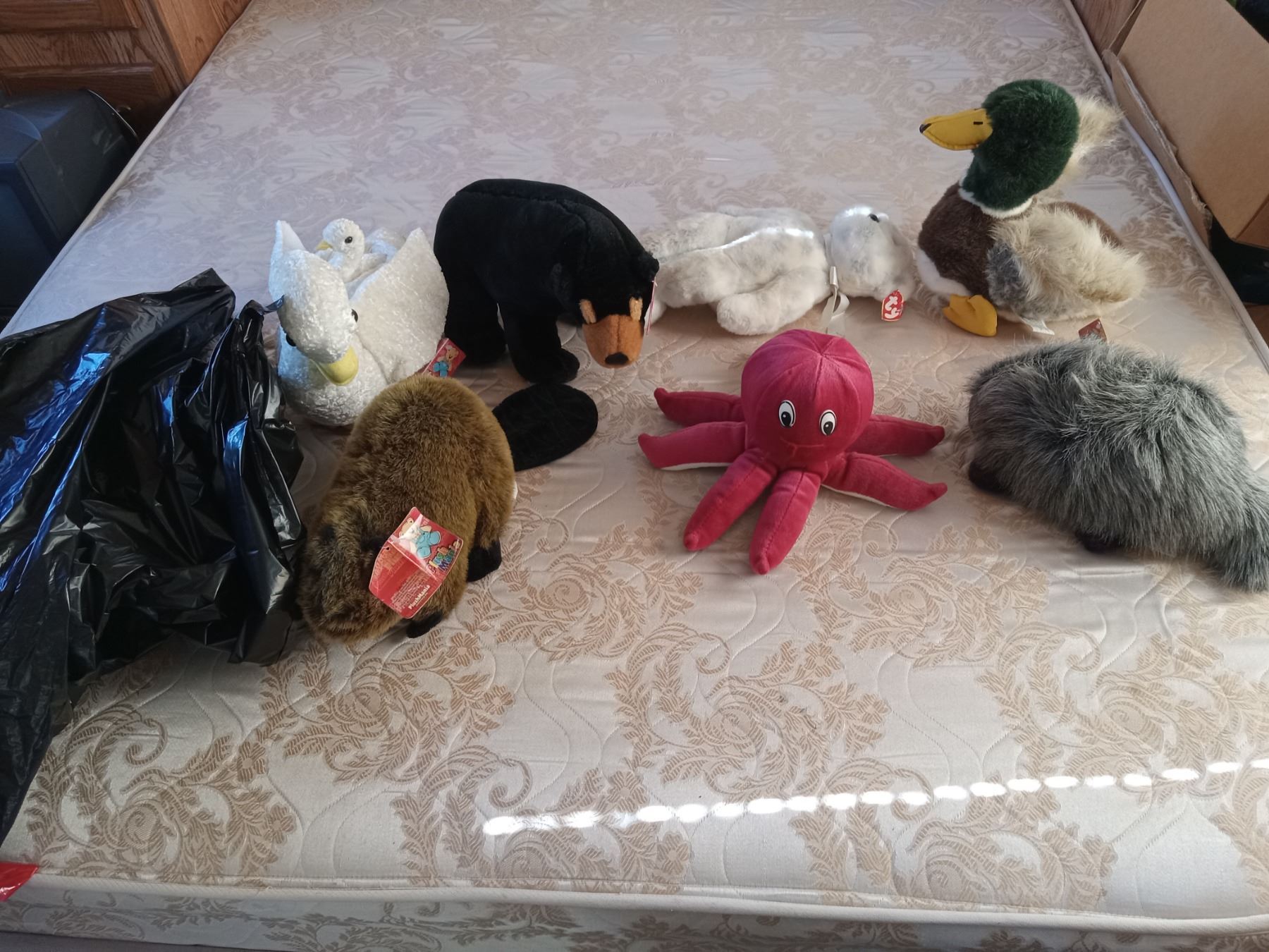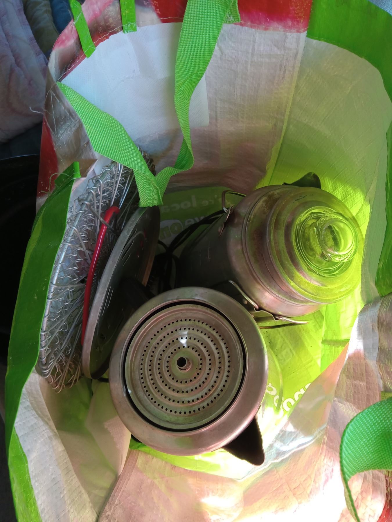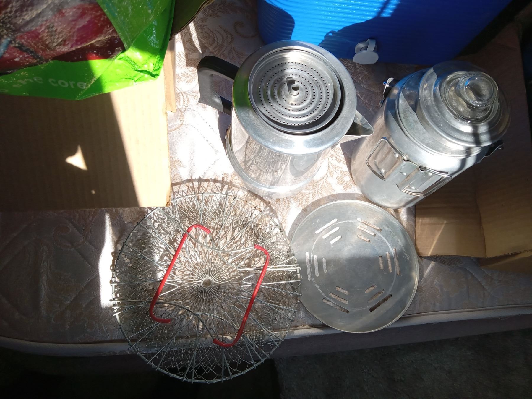 LG. ASSORTED VARIETY of CAMPING NEEDS, EQUIPMENT & SUPPLIES, COFFEE PERKS, ETC. LINENS, CAMP CHAIR, BLACK BAG OF STUFFIES -COLLECTIBLE*(SEE PHOTOS)
