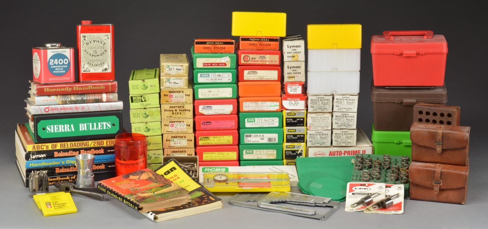 ACCESSORIES. This lot also contains components, loading blocks & books. May contain hollow point components. Notable reloading manuals include: “Hand Loading Ammunition” by Mattern. / 3 Volumes of “Lyman 45th Edition” manual. / 5th Edition of “Hand Loaders Digest”. / NRA illustrated reloading hand book. / “Lyman Reloading Handbook 46th Edition”. 2 Hand decapping tools for Berdan Primers, 1 marked “360 DR GM” & other unmarked. / 20+ RCBS shell holders. / 2 Lyman ideal shell resizers, 22/250 & .250/3000 Sav. / Numerous die sets, most are complete w/ boxes while some are loose. Some may be partial sets. Makes include RCBS, Herter, Bonanza & Lyman. Notable Herter calibers include: 44 Mag. & .222. Lyman dies include: 41 Mag. & 223. / Bonanza dies include: 32 Win. Special Benchrest. / 6mm Rem. Benchrest. / 240 WEA Benchrest & 22 Rem. Jet. / RCBS dies include: 350 Rem. / 7mm WEA. mag. / 8.15 46R, Sizer, File Trim die, expander die & 240 WEA. mag. / Lg. quantity of 25+ 22 250 seating/crimping die. / 5 Vickerman seating dies, appearing new includes: 1 22, 1 6mm, 1 27 & 2 .30. / Lee powder measure kit & numerous Chamfering tools. / Foster case length gauges include 222 Rem., 243 & 244. / 2 Lee Auto-Prime II sets. / 6 Lyman mould blocks. Sizes include .358, .311, .429 & .500 RB. / 1 Thompson Center Seneca 36 Cal. RB. Components include: full box of 20 Spear 640 grain / 50 cal. FMJ BT / 2 Partial boxes, sm. quantity of Dummy 380 & 9mm Luger & 8 12 ga. paper dummy shot shells. / Approx. 800, cast lead 6.5 bullets in shop made wooden container. / Lg. quantity of assorted loading blocks, both wood & plastic. CONDITION: from well used to new in box. Books may have wear, sm. tears & staining but are all generally legible. (02-14113/RW). $300-500.