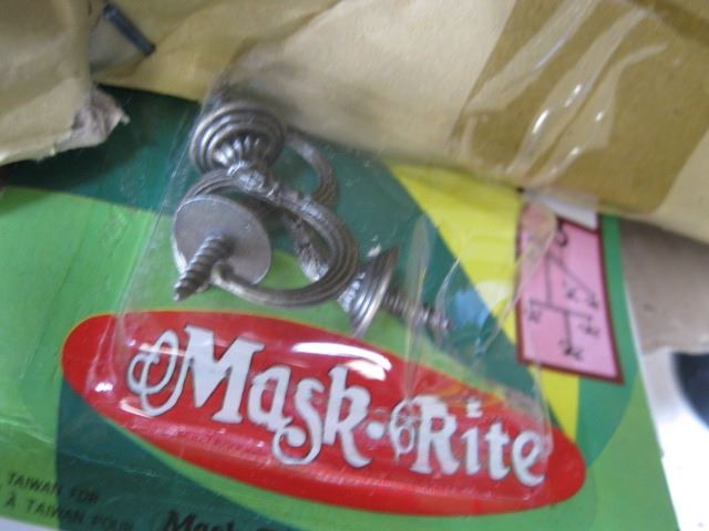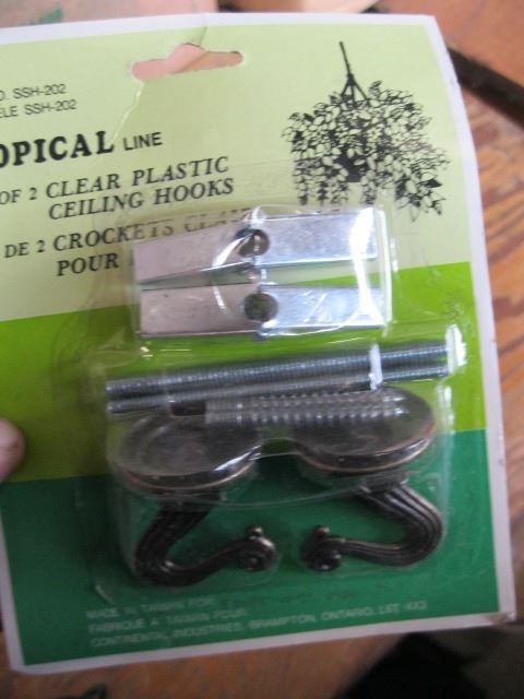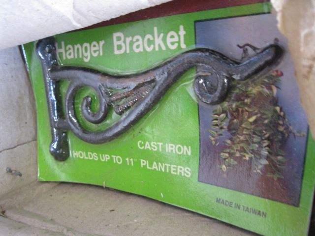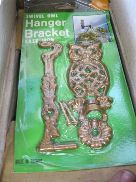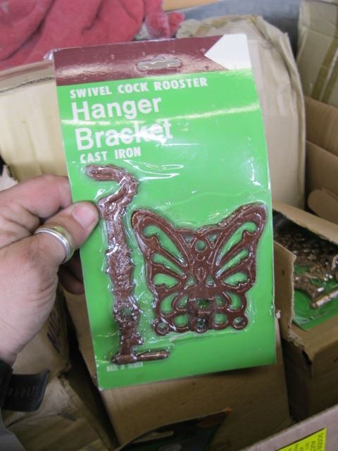 LG. BOX OF ASST. BASKET HANGERS, CEILING HOOKS, ETC.