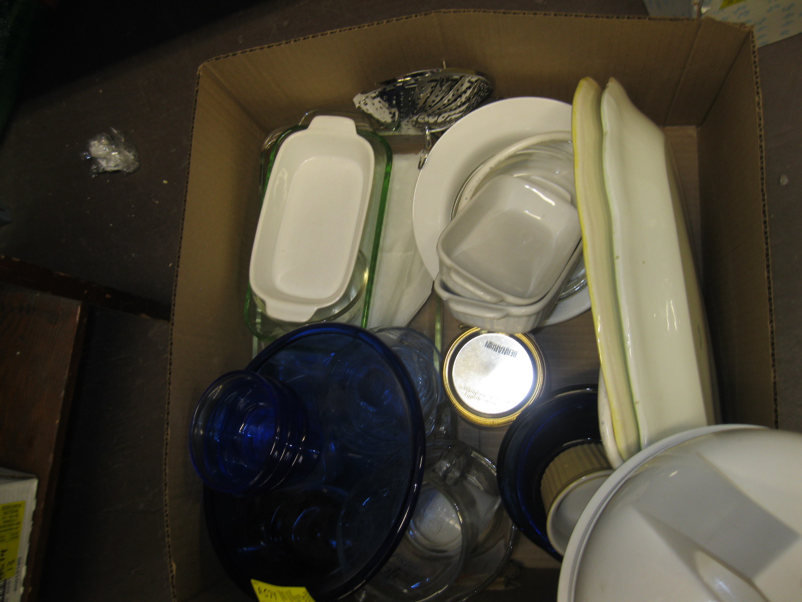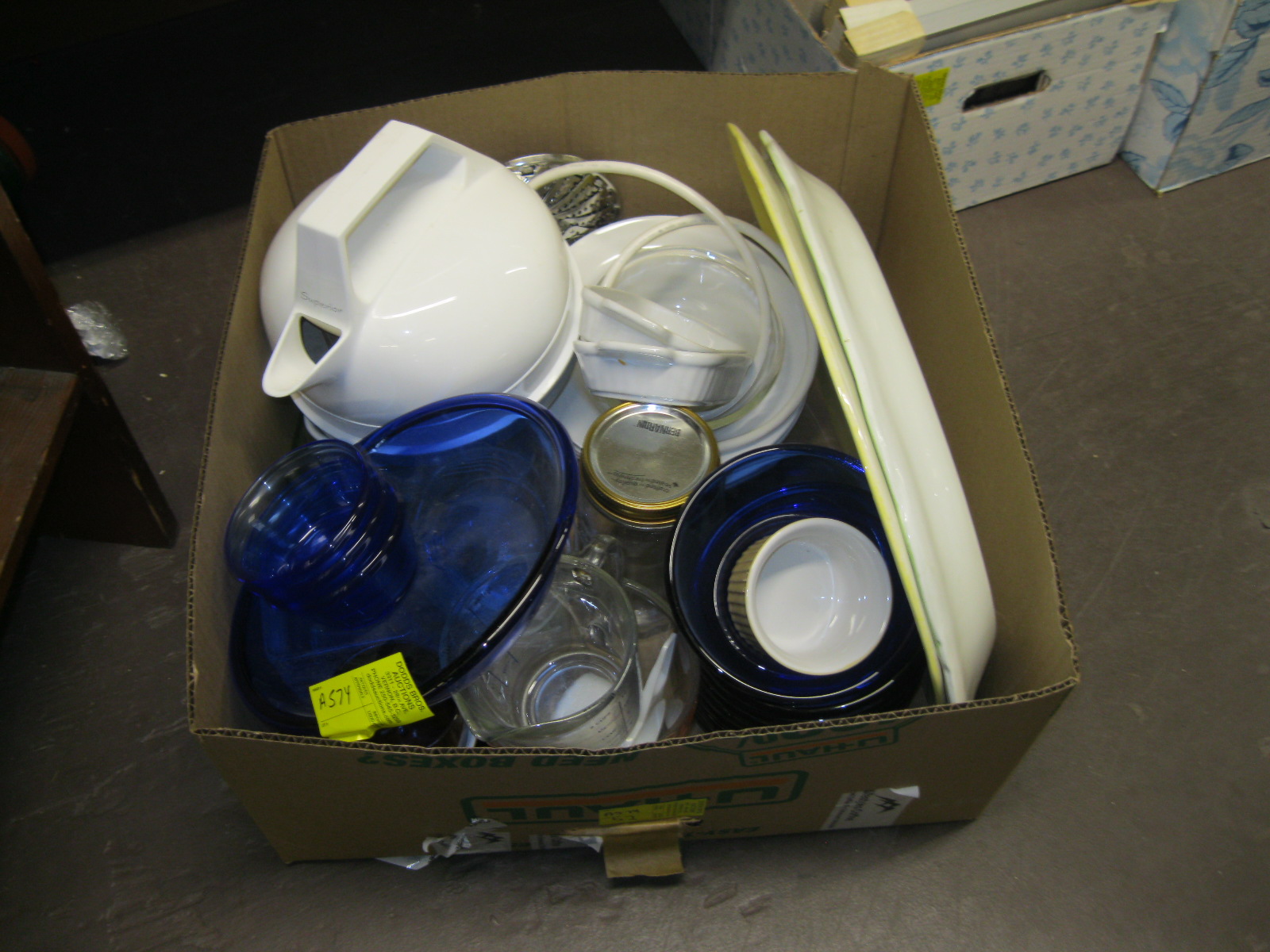 LG. BOX OF MISC. DISHES, PLATES, KETTLE, ETC.